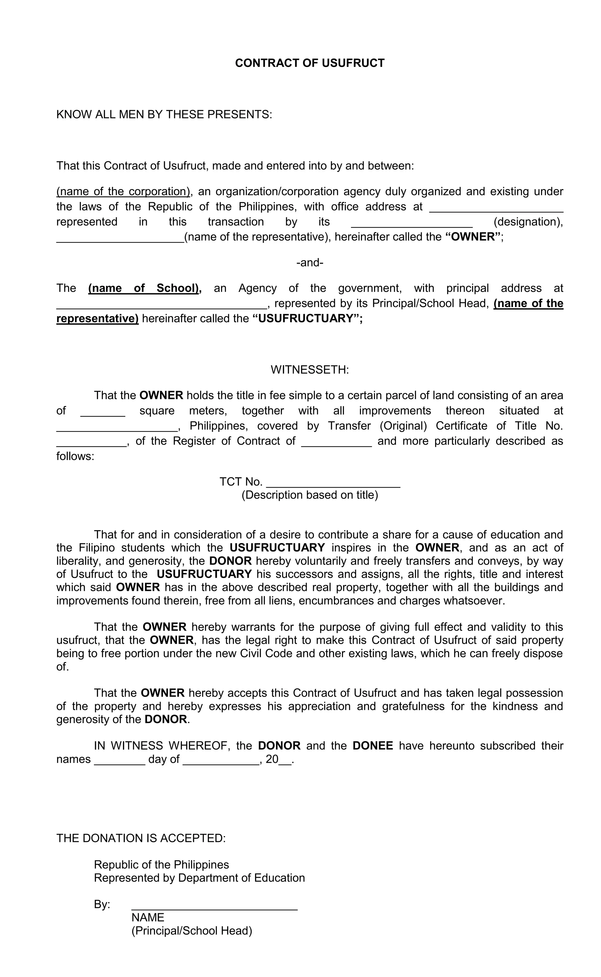 This document is a contract of usufruct between a corporation and a school. It transfers ownership rights of a parcel of land from the corporation to the school to use for educational purposes. Specifically, it conveys a piece of land measuring approximately square meters from the corporation to the school. It does so voluntarily as a donation to support education. The corporation warrants they have legal right to transfer the land. Both parties agree to the terms and sign the contract.