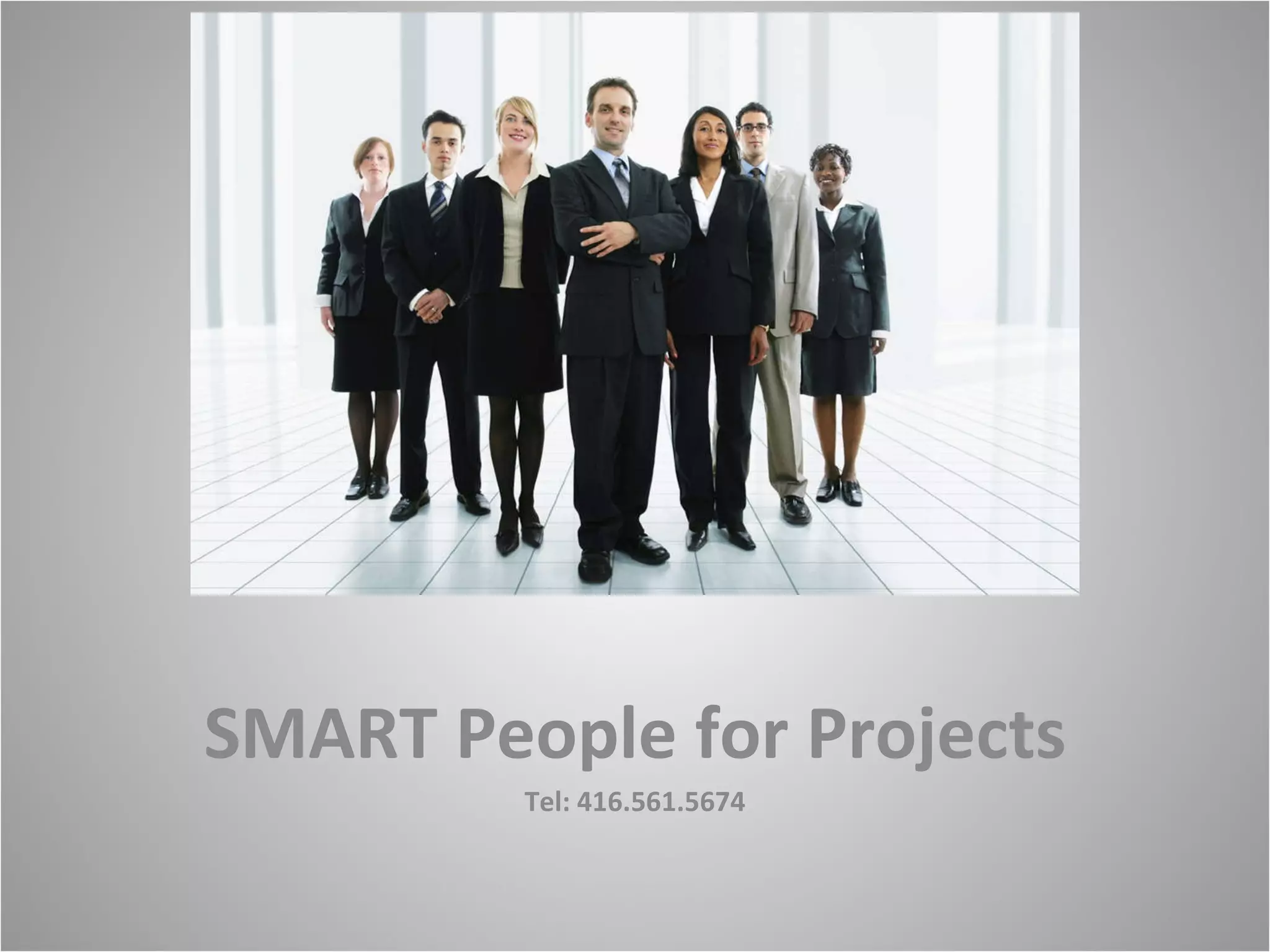 SMART People for Projects provides IT consulting and recruiting services including contract projects, permanent placements, and contractor consolidation. They have 27 years of experience and can source knowledge specialists in many IT areas. Their contract-to-hire model allows clients to try candidates before making a long term commitment, with no backend fees if the contractor is not retained after 6 months. Contractor consolidation provides a single point of contact while protecting contractor relationships and administering payments, insurance, and reporting.