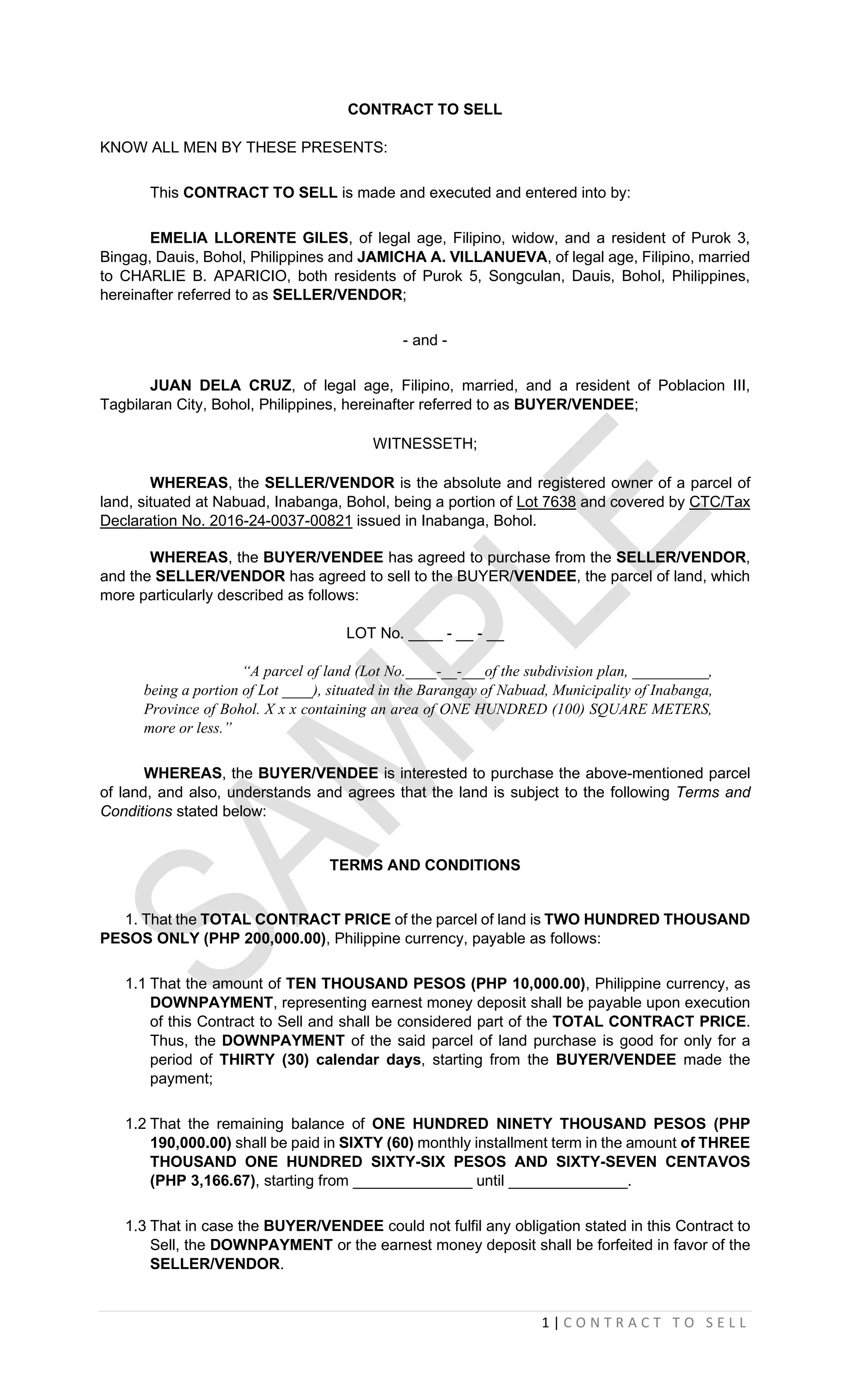 Tagbilaran City, Bohol, Philippines, hereinafter referred to as BUYER/VENDEE;