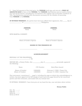 - The vendor agrees to sell a land area of LAND AREA IN WORDS (000) square meters to the vendee located at the specified address.