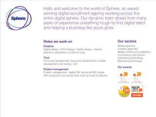 Sphere is an award-winning digital recruitment agency that specializes in unearthing hard-to-find digital talent for clients across media, creative, technology, and marketing sectors. They provide contract, permanent, graduate, and international hiring solutions as well as project staffing and executive search. Clients praise Sphere for consistently delivering results beyond expectations through their bespoke, intuitive service and in-depth market knowledge.