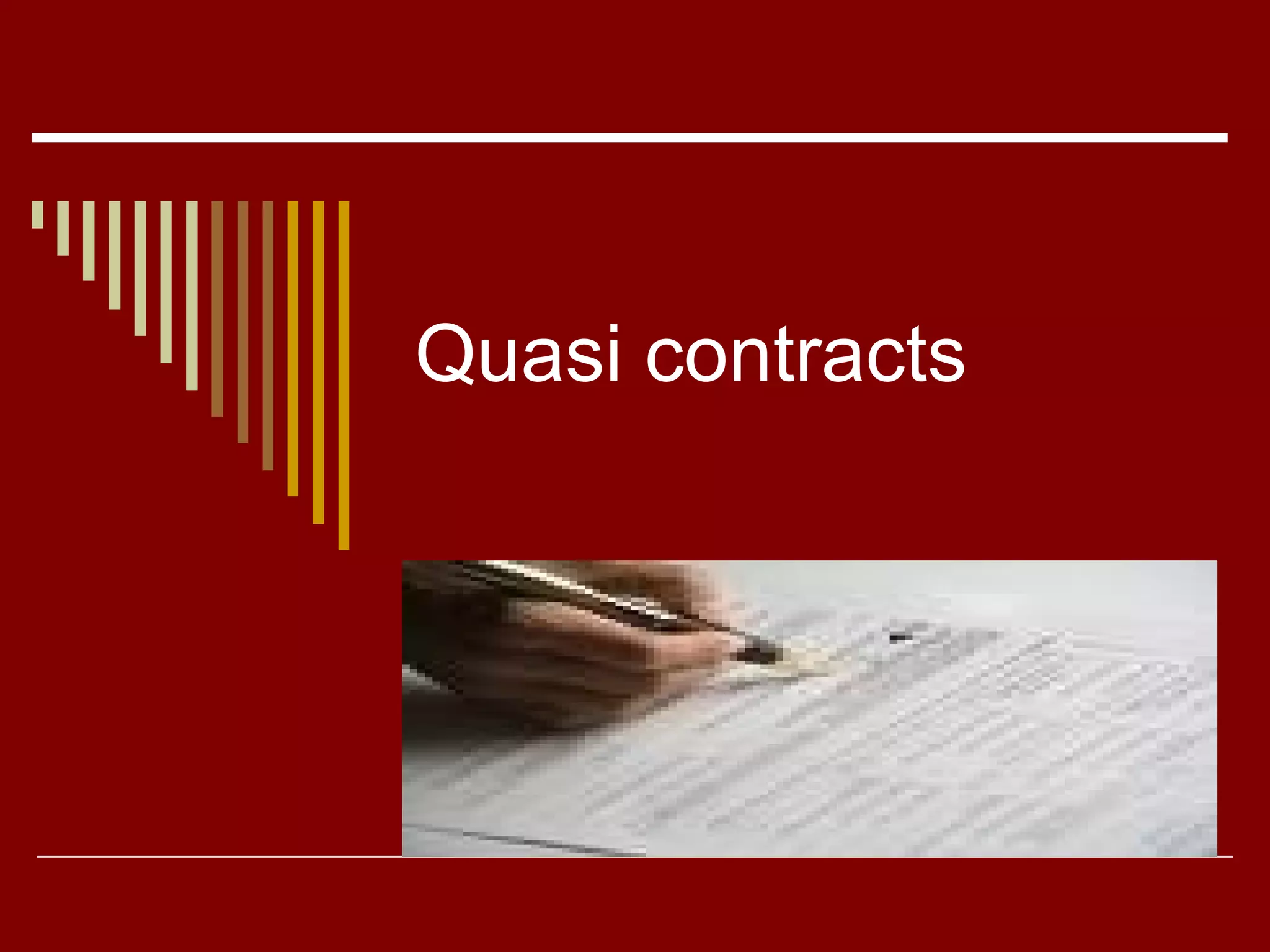 Quasi contracts are obligations imposed by law that are not true contracts as one or more essential elements of a contract are missing. They are based on principles of equity and justice to prevent unjust enrichment. Some types of quasi contracts include recovery of money paid by mistake or under coercion, or for necessaries provided. Quantum meruit allows recovery of payment for work done even if the full contract is not completed, in proportion to the work performed. Breach of contract involves failing to meet obligations of an agreement. Available remedies for the injured party include rescission, damages, specific performance, injunctions, and quantum meruit claims.