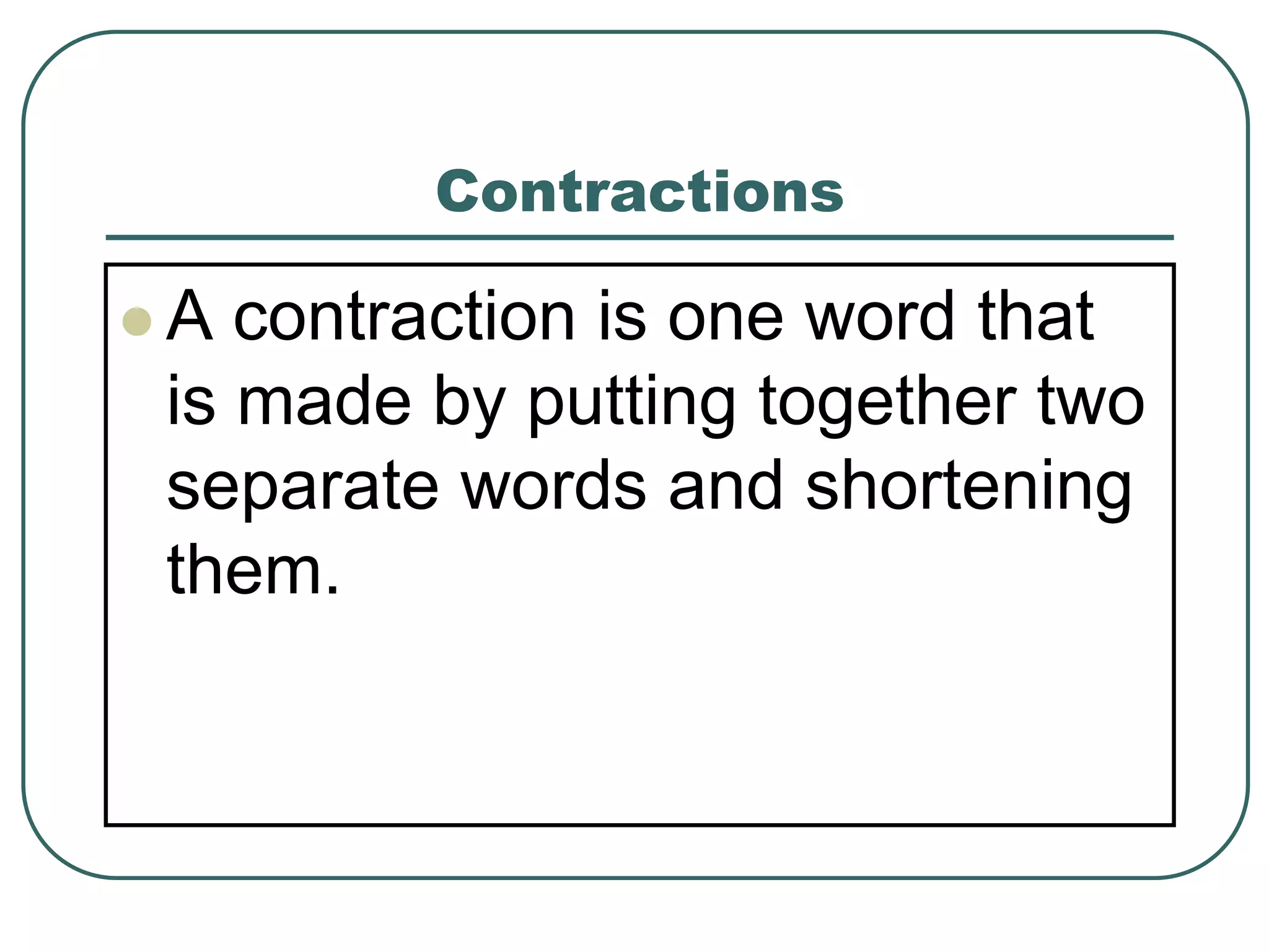 This document provides information about contractions in English. It defines contractions as two words combined into one with letters removed. There are about 70 contractions, most commonly formed by removing two letters like "she'll". Common contractions are formed from combinations of pronouns with "is", "are", "will", "have", "had", and "not". The document gives examples of each type of contraction and includes a game to practice forming contractions.