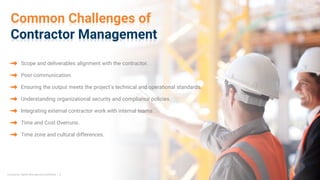 The document outlines the features and benefits of a contractor safety management software developed by Tech EHS Solutions, addressing common challenges in contractor management such as communication, compliance, and operational alignment. It details functionalities like worker registration, training management, monitoring, and reporting to enhance safety and efficiency. Additionally, it emphasizes the software's capability for integration and customization, underscoring its positive industry recognition.
