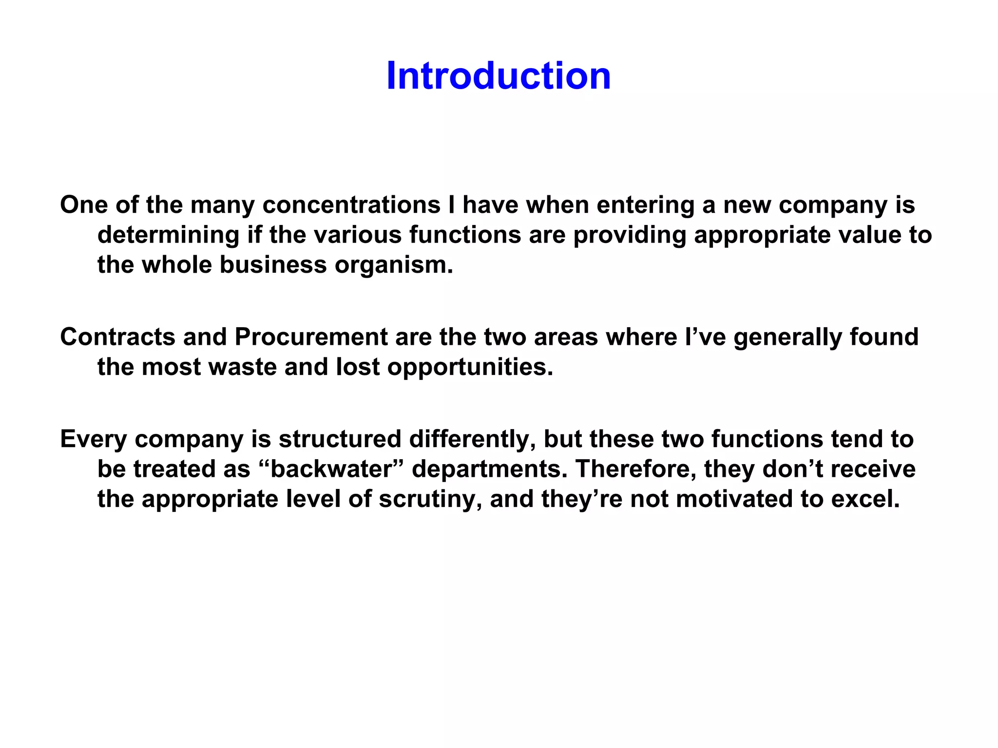 The document discusses the critical functions of contracts and procurement within companies, emphasizing the importance of giving these areas proper scrutiny to prevent waste and lost opportunities. It provides real-world examples of inefficiencies and suggests that involving procurement and contracts personnel from the beginning to the end of projects can lead to better outcomes. The conclusion stresses the need for management support and resources for these functions to enhance their effectiveness.