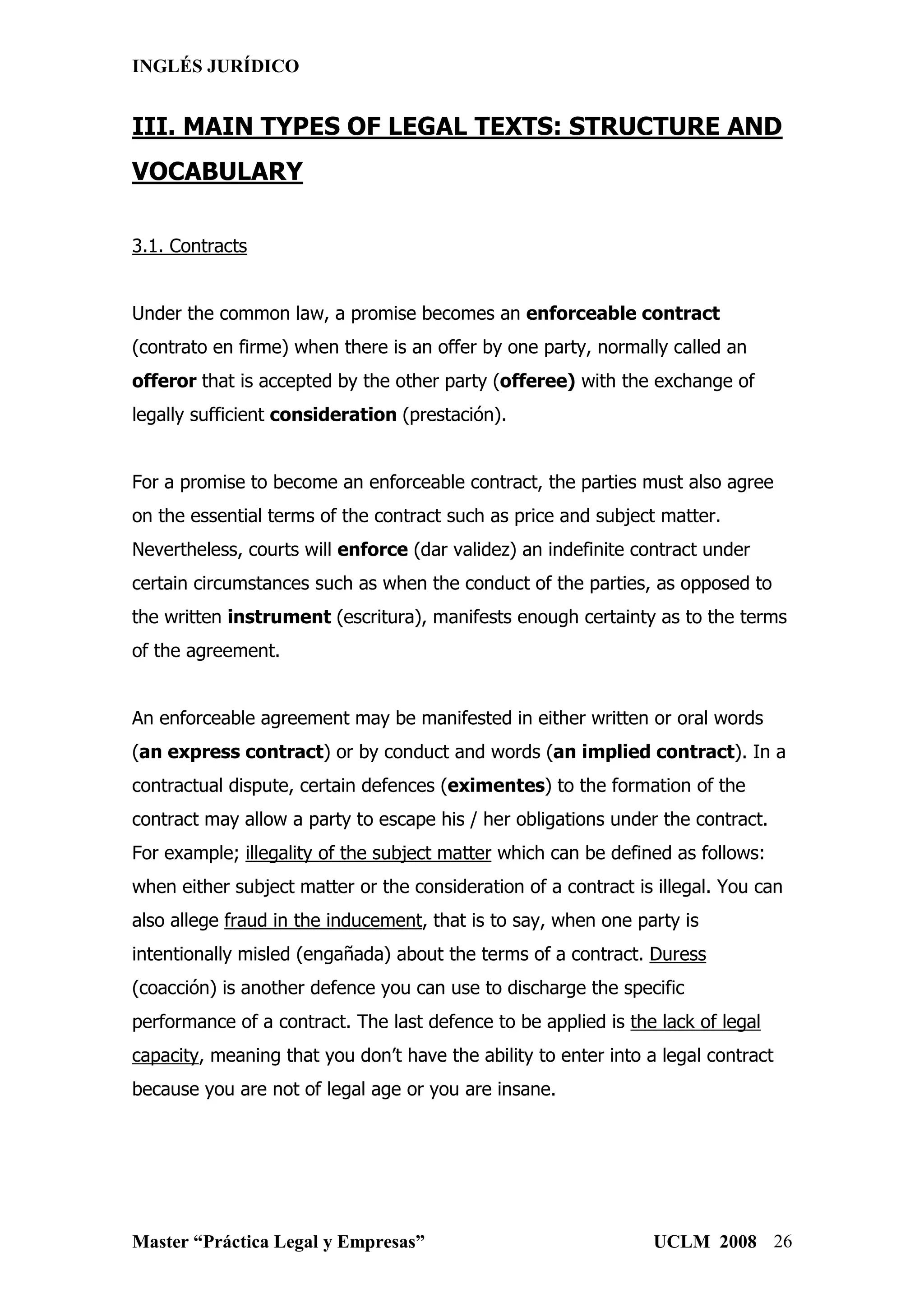 This document discusses different types of legal texts and contracts. It provides details on the key elements of a contract, including offer, acceptance, consideration. Defenses to the formation of a contract are also outlined, such as illegality, fraud, duress, lack of capacity. Common contract clauses like acceleration, assignment, confidentiality and termination are defined. The main types of contracts like purchase/sale, lease, and employment are also summarized along with typical terms and how they can be terminated.