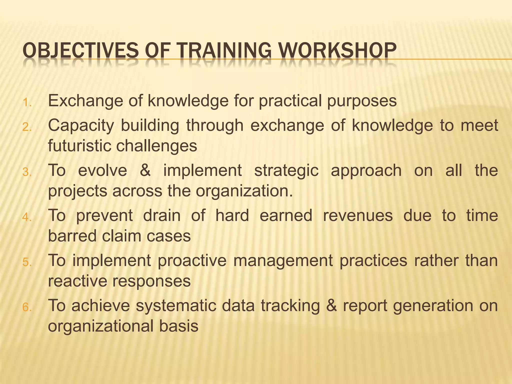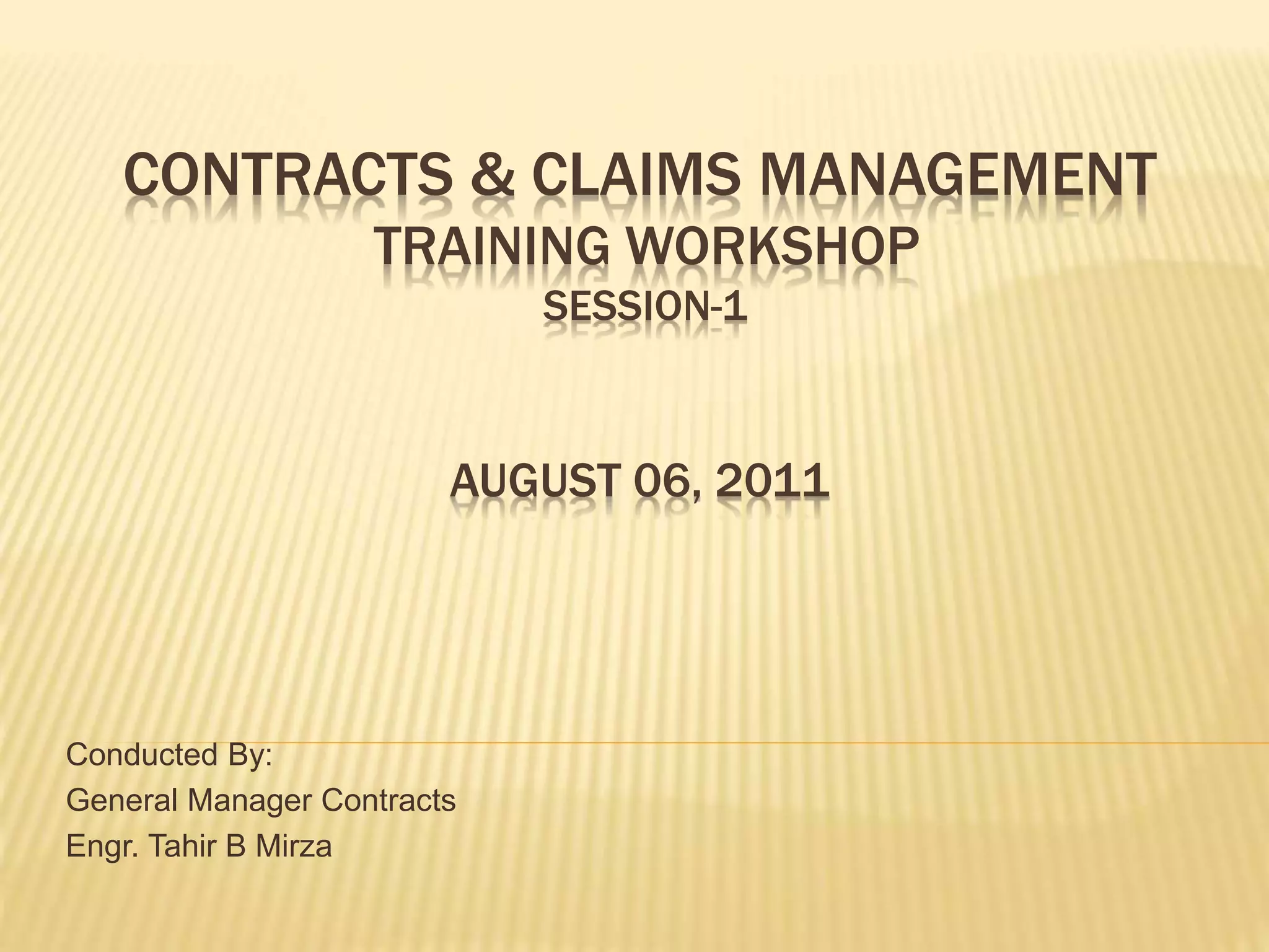 The document provides guidelines for identifying, documenting, and presenting construction claims. It discusses objectives of keeping accurate records to support potential claims related to delays, disruptions or other contract issues. Key points covered include rules of engagement for contractors, identifying claim-worthy events, maintaining thorough documentation, and properly establishing a claim's entitlement and quantum or monetary value. The presentation provided templates for organizing supporting records and a general format for submitting a formal claim, including an executive summary, entitlement and quantum analyses, and factual exhibits.