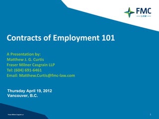 This presentation by Matthew Curtis discusses the importance of written employment contracts, highlighting key terms such as vacation, wages, and termination obligations. It emphasizes the need for clarity and legality to avoid disputes, detailing aspects like probation periods and the significance of independent legal advice for employees. The document also mentions the consequences of inadequate contracts according to the B.C. Employment Standards Act and common law.