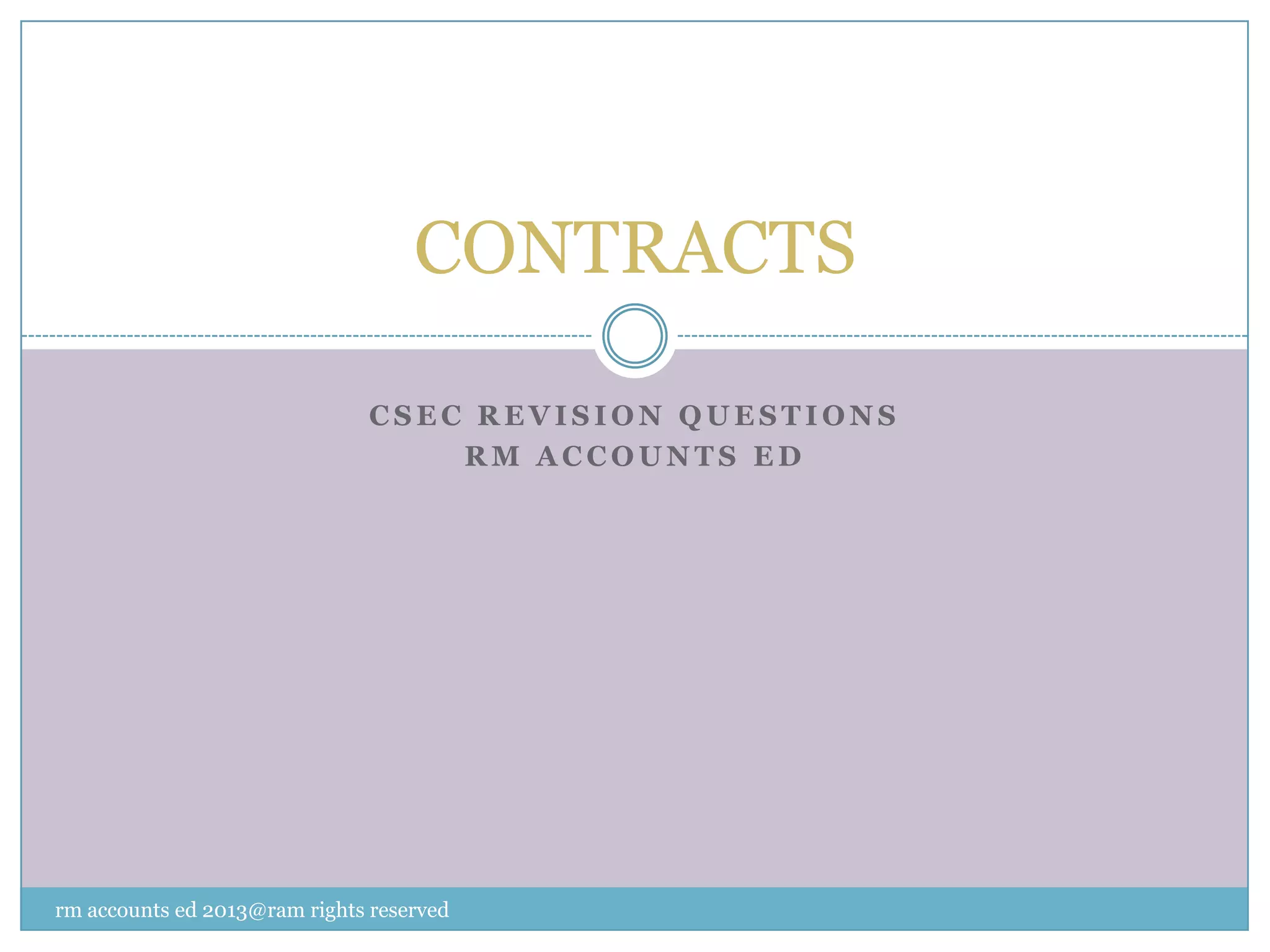 This document contains questions about contracts for a revision exam. It asks about the definition of a contract and characteristics of a valid contract. It also asks about terms related to contracts like offer, offerer, offeree and consideration. Other questions address ways contracts can be discharged and categories of persons not having capacity to enter contracts. Specific legal terms like discharge of contract, executory consideration and frustration of contract are also defined. Examples of simple contracts and specialty contracts are provided to determine the type of contract.