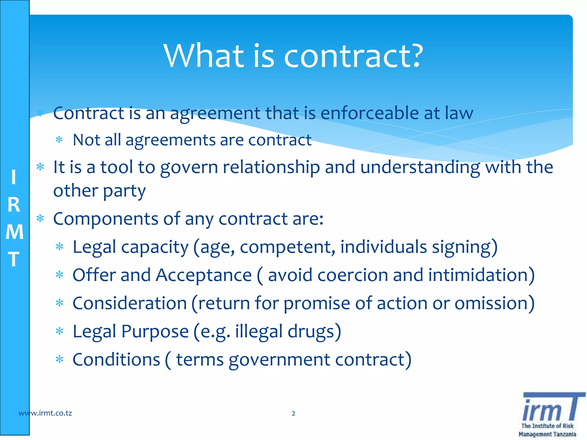The document outlines comprehensive principles and practices of contract risk management, emphasizing the significance of effective contract life cycle management for optimal operational and financial performance. It details components of contracts, stages of preparation, negotiation, execution, and post-award activities while identifying common risks and pain points within contract management. Recommendations include developing written policies, utilizing risk assessment frameworks, and ensuring thorough reviews and adaptability to changing circumstances.