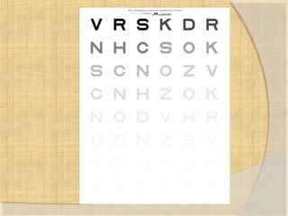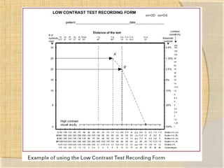 This document discusses various contrast sensitivity tests used in vision testing. It describes several grating and letter-based contrast sensitivity charts, including the FACT chart, Pelli-Robson chart, Vistech tests, and Cambridge Low Contrast tests. It provides details on test administration and scoring for many of these assessments. The document also discusses computer-based contrast sensitivity testing and considerations for contrast calibration of video displays used for testing.