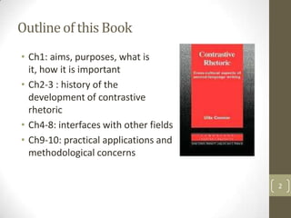 This document provides an overview of contrastive rhetoric, which examines how a person's first language and culture influence their writing in a second language. It traces the history and development of contrastive rhetoric from the 1960s to present. It also discusses key topics like how contrastive rhetoric relates to applied linguistics, composition studies, genre studies, and research methods. The overall purpose is to raise awareness of cultural differences in writing patterns across languages.
