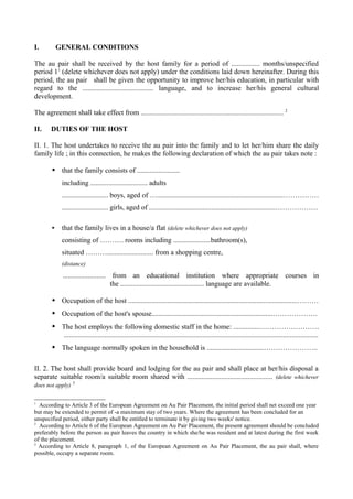 This agreement establishes an au pair placement between a host family and an au pair. It outlines the general conditions of the placement including its duration, the duties of the host to provide room and board, pocket money, free time, and health insurance or affiliation to social security. It also outlines the au pair's duties to participate in daily family duties for a specified number of hours per day. The agreement is signed by both parties and copies are retained by each party and a competent authority.
