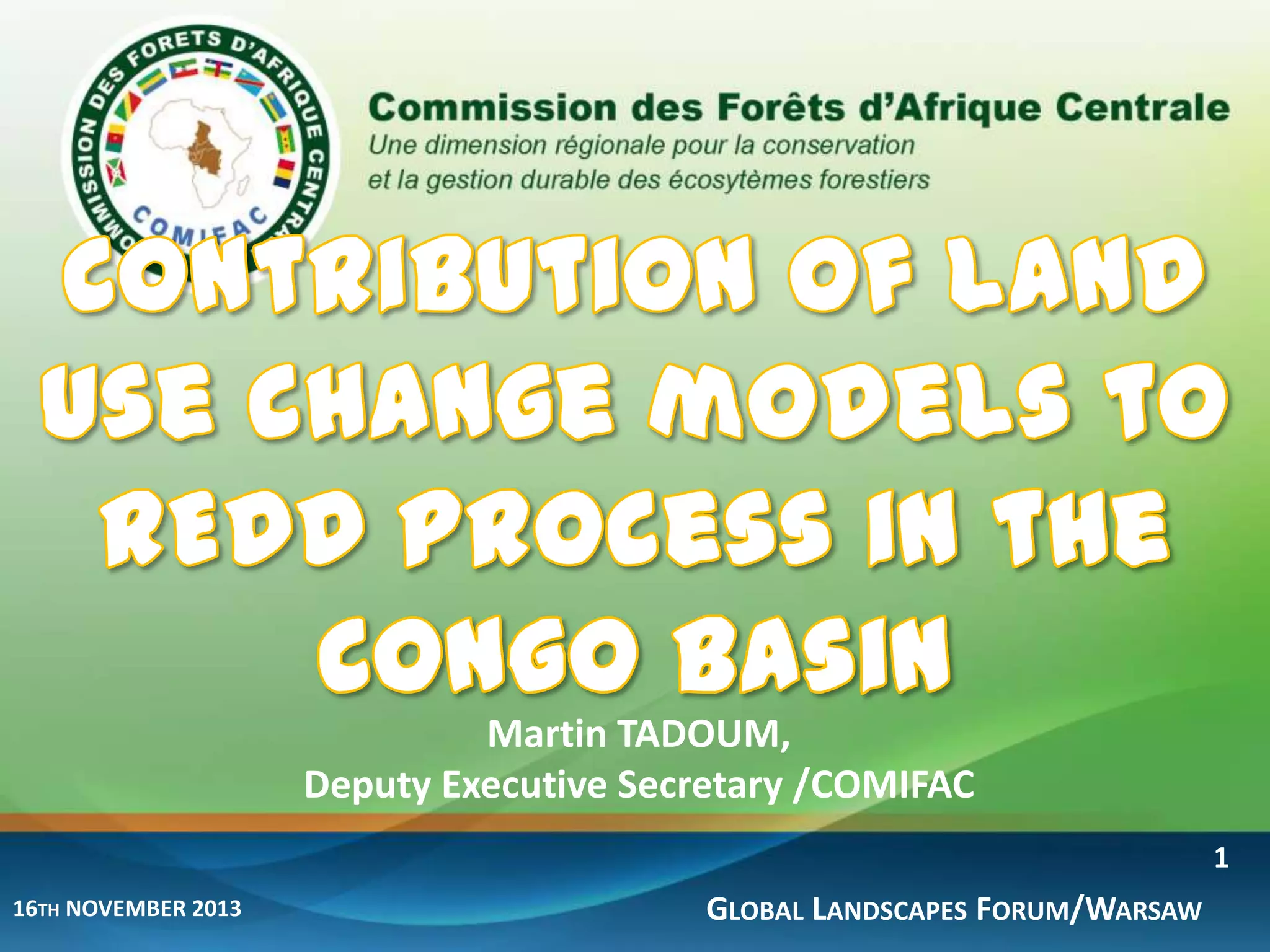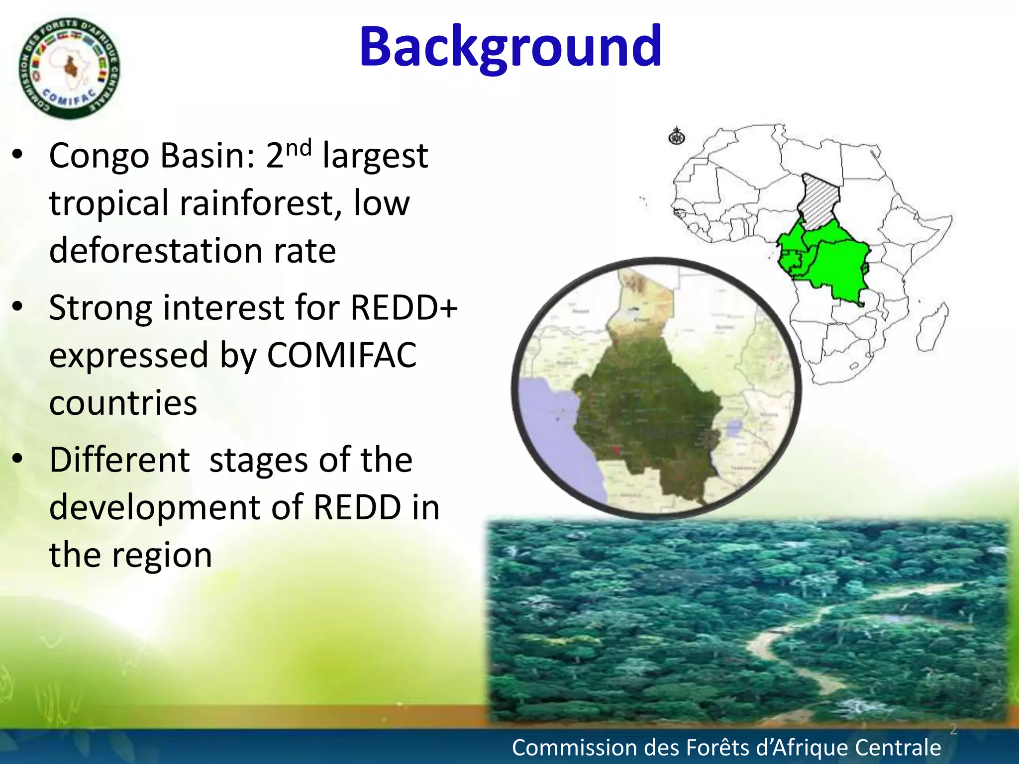 The document discusses the Congo Basin's REDD+ (Reducing Emissions from Deforestation and Forest Degradation) initiatives, highlighting the region's low deforestation rate and various stages of REDD+ development among member countries. It emphasizes the need for a sustainable measurement system and the modeling of deforestation trends in light of internal and external pressures. The Congobiom model is introduced as a tool to analyze future deforestation trends, support policy decisions, and enhance understanding of economic impacts on forest cover.