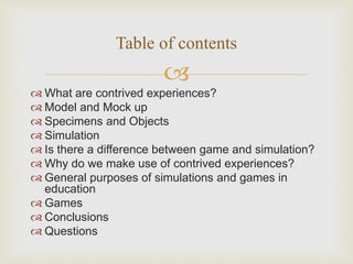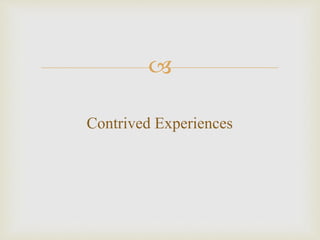 This document discusses contrived experiences, which are edited representations of reality used as substitutes for real things in education. Contrived experiences include models, mockups, specimens, objects, simulations, and games. Models are small or large reproductions of real things made of synthetic materials. Mockups highlight and magnify parts of a process. Specimens are typical examples of a group. Simulations actively engage learners in real events. Games have winners while simulations study issues. Contrived experiences are used to overcome limitations, edit reality, understand abstractions, and prepare learners for new roles.