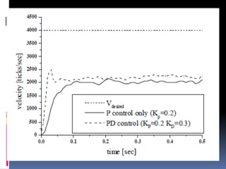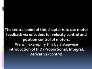 This document discusses various types of motor control, including on-off control and PID control. It begins with an overview of closed-loop control using motor feedback via encoders for velocity and position control. The main focus is on introducing PID control in a step-wise manner, first explaining on-off control and then proportional, integral and derivative controllers. It provides the mathematical formulas for these controller types and discusses implementing them in software and tuning the PID parameters.