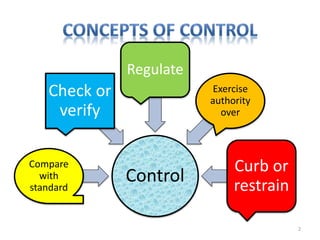 The document discusses the principles of control in management. It defines control as measuring and correcting performance to ensure objectives are achieved. Control involves setting standards, measuring performance, comparing results to standards, introducing corrective measures if needed, and following up. Traditional control techniques discussed include budgetary control, cost control, statistical control, and financial statements. Modern techniques mentioned are critical path method (CPM), program evaluation and review technique (PERT), return on investment, management audit, and management by objectives (MBO). The relationship between planning and control is also explained, with planning establishing the basis for control.