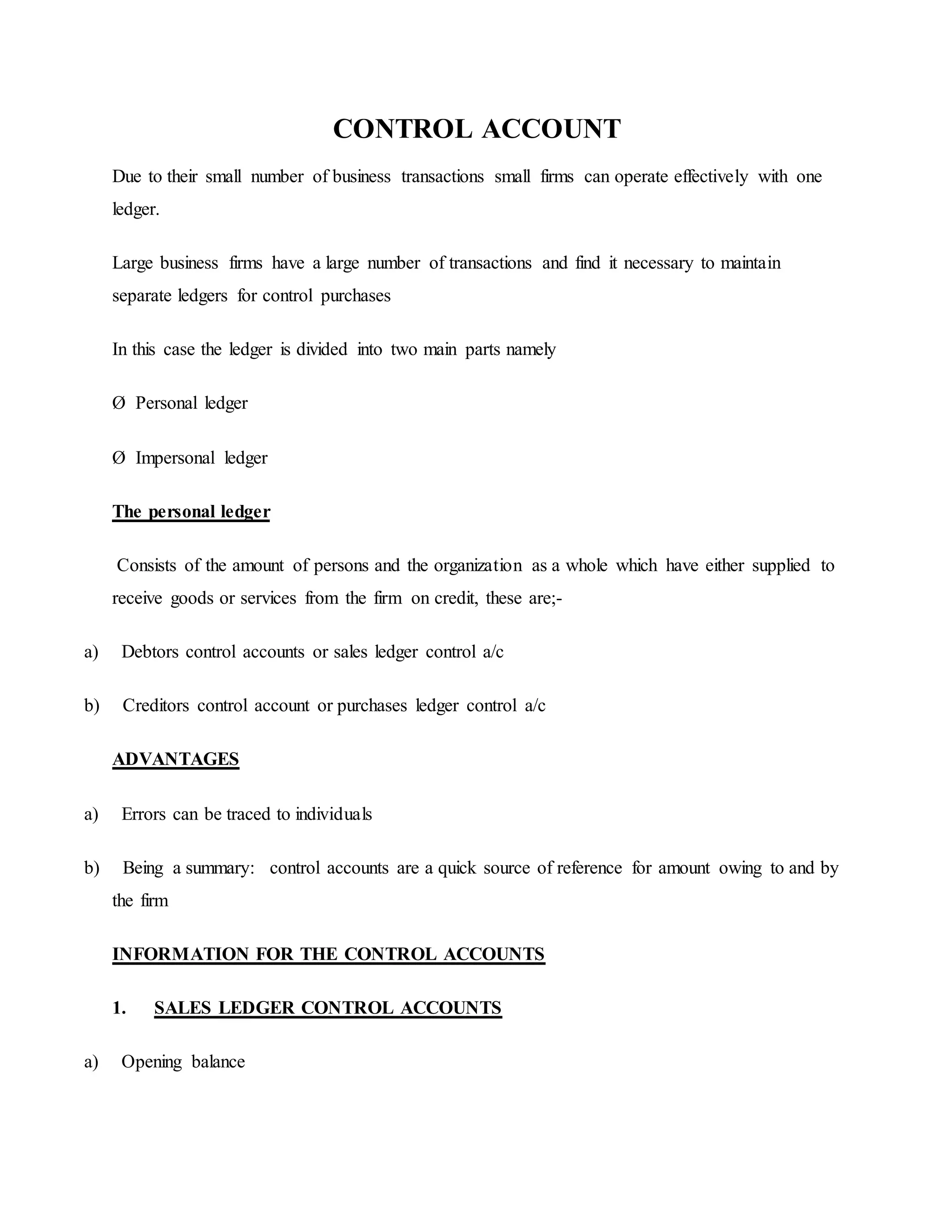 - The document discusses control accounts used by large businesses to manage transactions between the firm and its customers (sales ledger) and suppliers (purchases ledger).