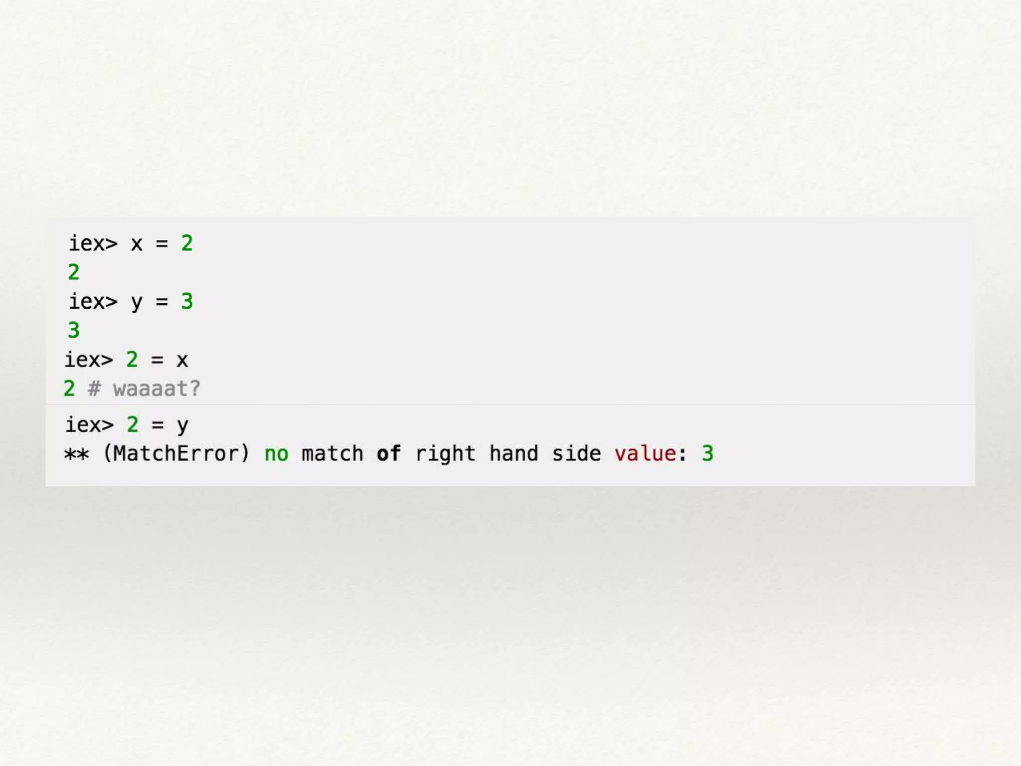 2) Variables in Elixir are bound to values through pattern matching rather than assignment.