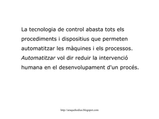 La tecnologia decontrol abasta tots els procediments i dispositius que permeten automatitzar les màquines i els processos. Automatitzar vol dir reduir la intervenció humana en el desenvolupament d'un procés.