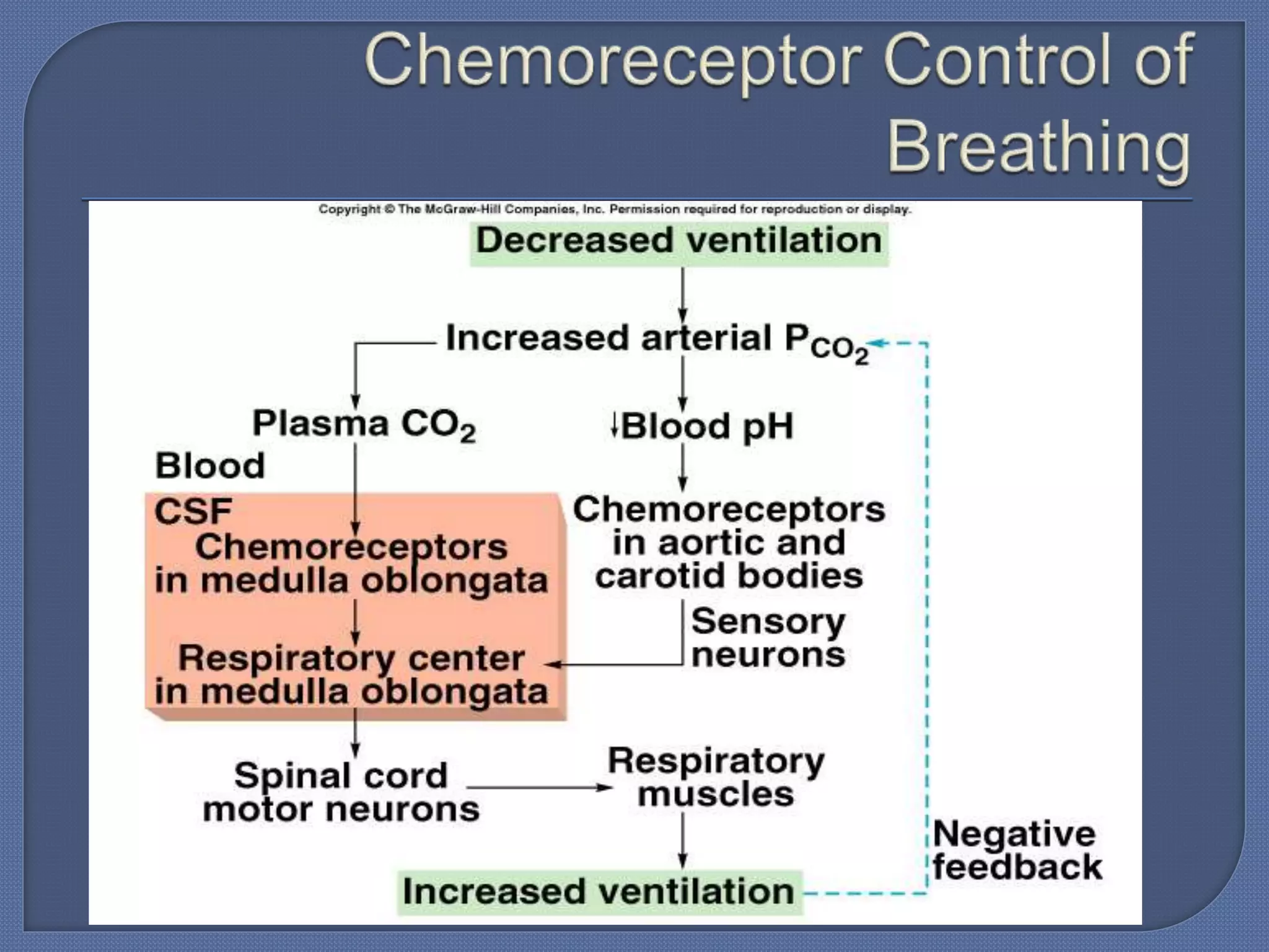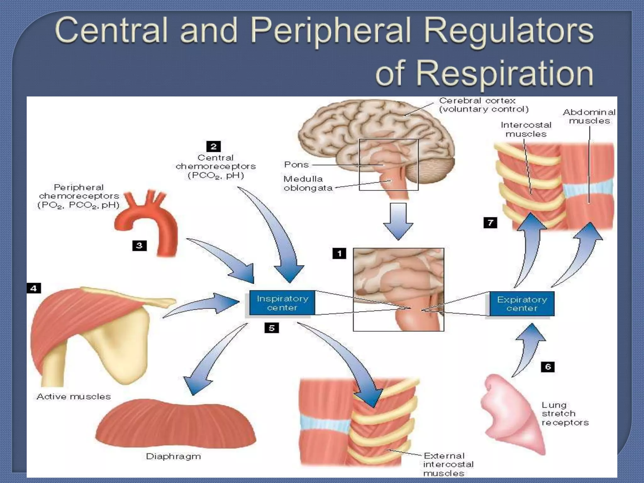 The document summarizes the neural control of breathing. It discusses how breathing is regulated by central neuronal networks in the brainstem and spinal cord to meet metabolic demands. The central neurons in the medulla and pons form the basic respiratory center that produces and controls respiration. These centers integrate input from higher brain areas, mechanoreceptors, and peripheral chemoreceptors. They regulate breathing frequency and tidal volume through motor neurons that control respiratory muscles. Chemical control of breathing also occurs through central and peripheral chemoreceptors that sense changes in blood gases like oxygen and carbon dioxide to modulate ventilation.