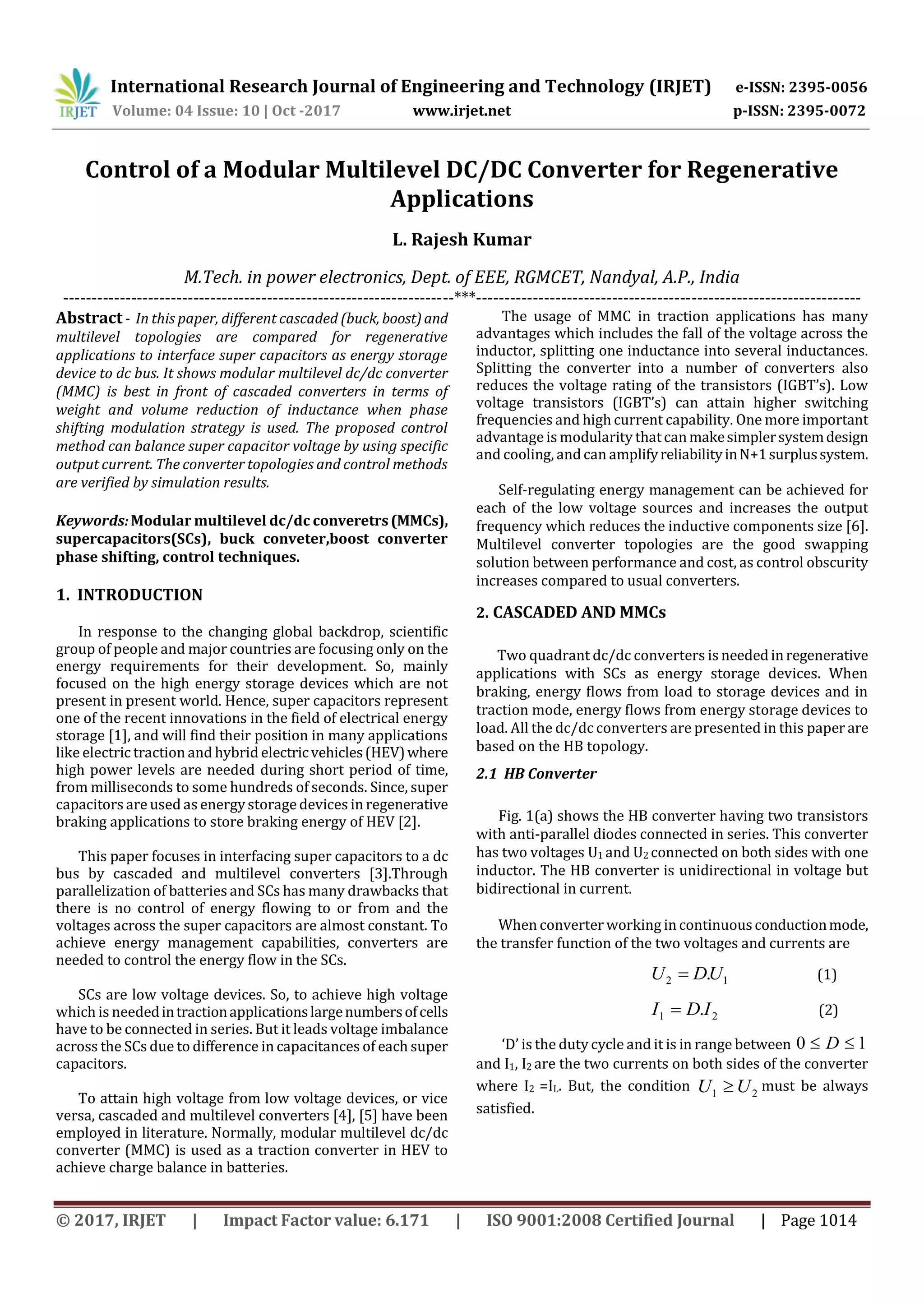 This document describes and compares different converter topologies for interfacing supercapacitors to a DC bus, including for regenerative applications. It finds that a modular multilevel DC/DC converter (MMC) has advantages over cascaded buck and boost converters in terms of reduced weight and volume of inductance. When using phase shifting modulation, the MMC can balance supercapacitor voltages through control of the output current. Simulation results show the MMC achieves lower current ripples and faster response times compared to the other topologies. Control methods are presented to regulate the output current and balance the supercapacitor voltages in the MMC.