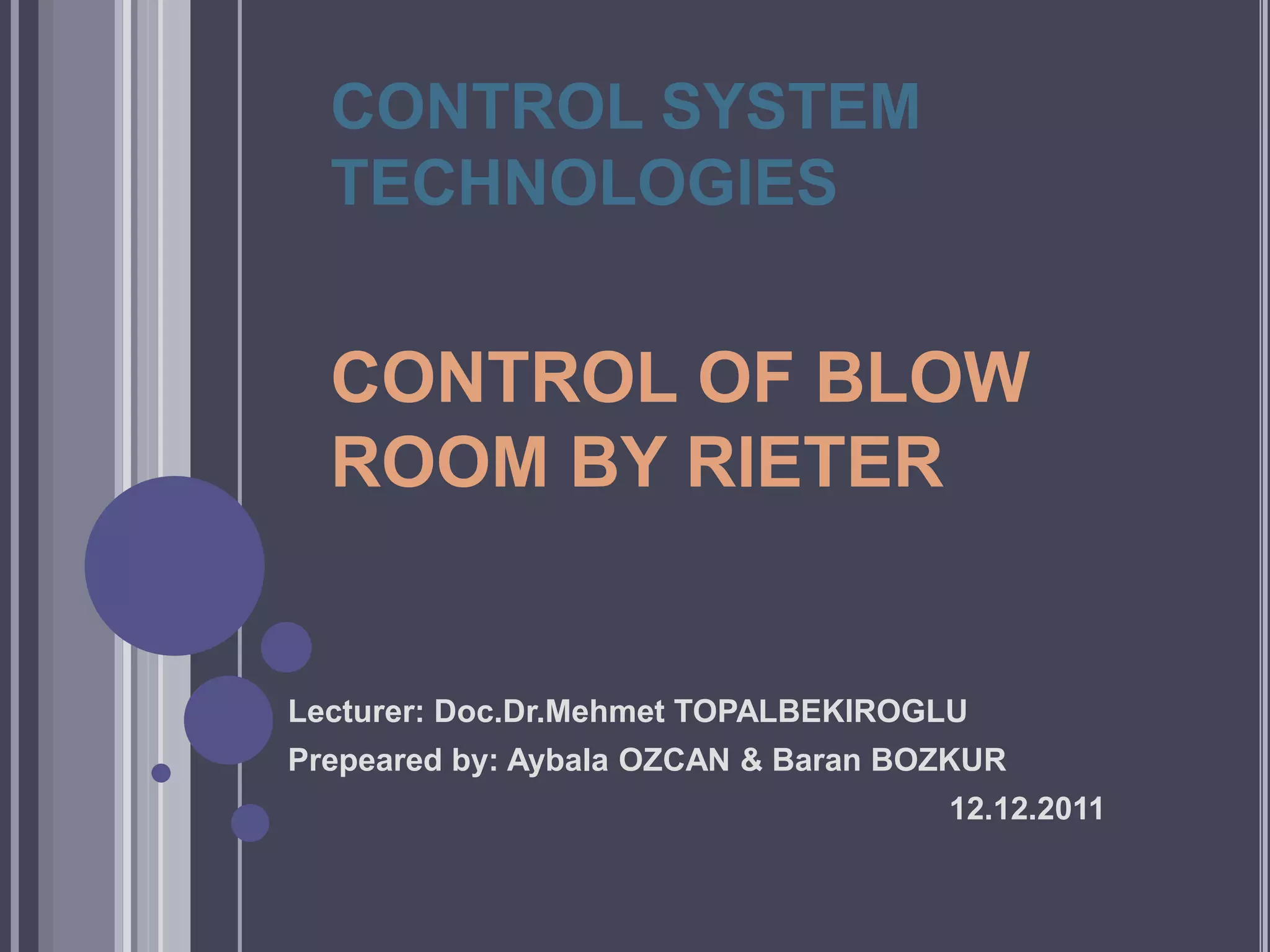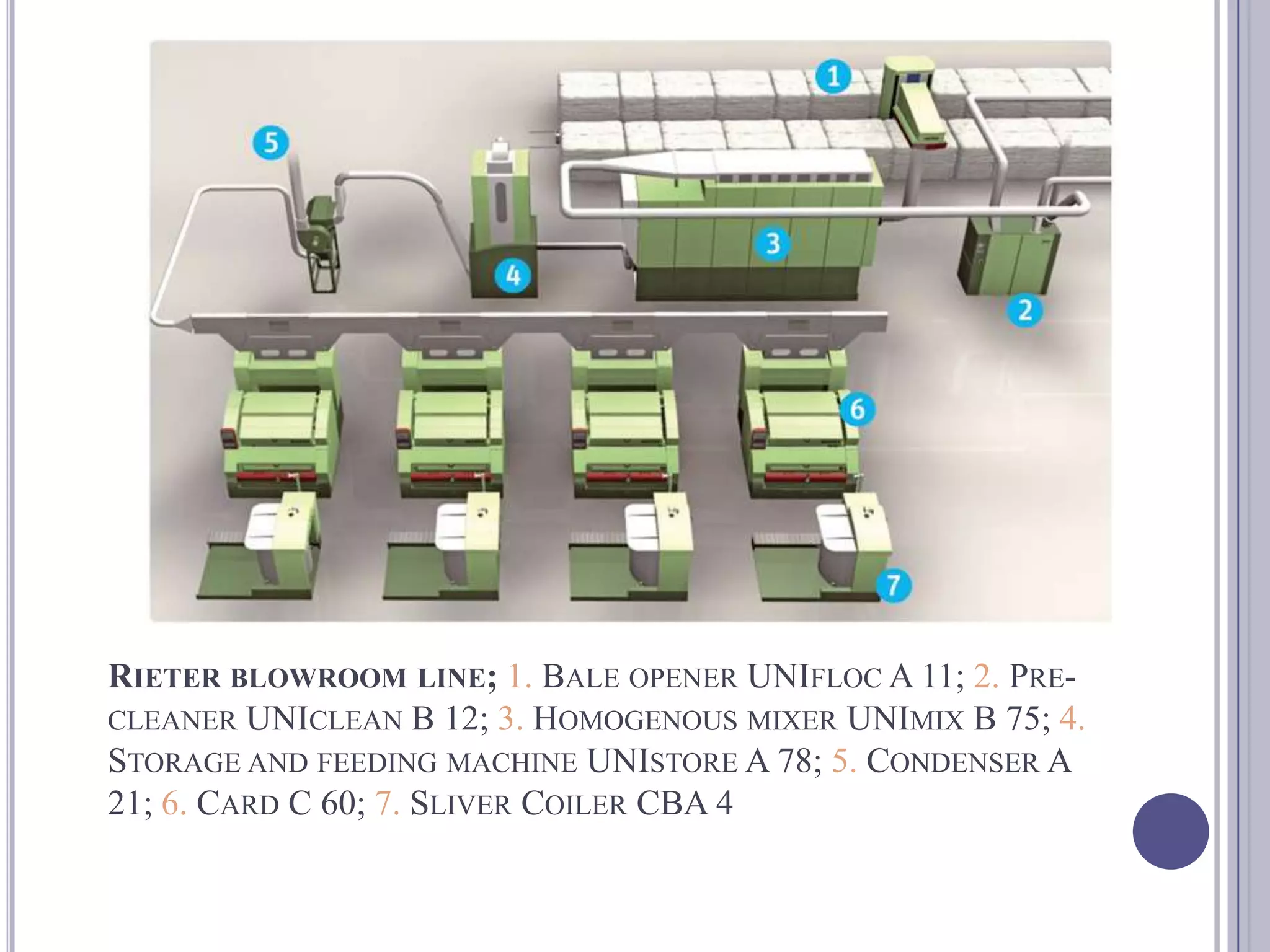 The document discusses control systems for blowroom machines from Rieter. It summarizes the functions and characteristics of various machines in the blowroom process, including the bale opener, pre-cleaner, homogeneous mixer, storage and feeding machine, and card. It also describes the control systems for machines like the bale opener, which uses sensors and motors connected to a control device to determine position and coordinate movement longitudinally and vertically.