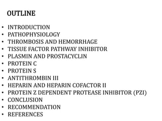 The document discusses the control of coagulation through various proteins and pathways that regulate clot formation and dissolution. Coagulation begins with tissue factor activating the coagulation cascade to form a clot. This is regulated by tissue factor pathway inhibitor and proteins that inhibit specific coagulation factors, such as protein C inhibiting factors V and VIII. Clot dissolution is mediated by plasmin and inhibited by alpha2-antiplasmin. Together these pathways maintain a balance between clot formation and removal. Deficiencies can lead to bleeding disorders or thrombosis.