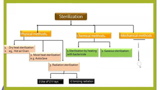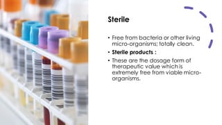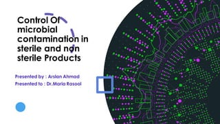 This document discusses control of microbial contamination in sterile and non-sterile pharmaceutical products. It describes sterilization methods like thermal sterilization using dry heat or moist heat, and non-thermal sterilization using radiation, filtration, or chemicals. It also discusses sources of contamination and control measures like environmental control, housekeeping, disinfecting surfaces, controlling air and personnel, automated processing, and concludes that sterilization requires constant effort to control microbial contamination.