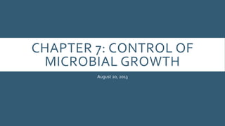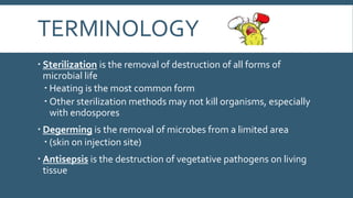 This chapter discusses methods for controlling microbial growth through sterilization, degerming, and antisepsis. It explains that sterilization kills all microbes including endospores using heat or other methods. Bacteria typically die at a constant rate depending on factors like number, environment, and exposure time. Physical methods for control include moist heat like autoclaving, dry heat, filtration, radiation, and low temperatures. Chemical methods use agents to control growth on living tissues and inanimate objects by changing the pH environment, with antiseptics used on living tissues and disinfectants on inanimate objects.