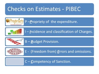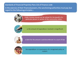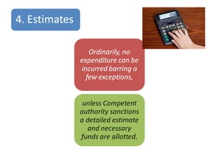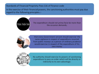 The document discusses tools for controlling expenditure, including budget proportions, monthly financial reviews, and schedules of powers. Budget proportions allow accounting officers to estimate projected spending under each sub-head of a grant based on factors like past spending patterns. Monthly financial reviews track actual versus estimated expenditure. Schedules of powers define spending limits of different levels of authority to ensure expenses are properly authorized.
