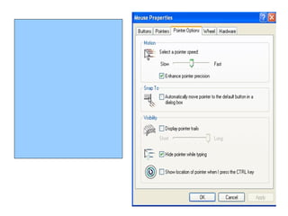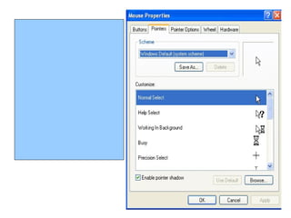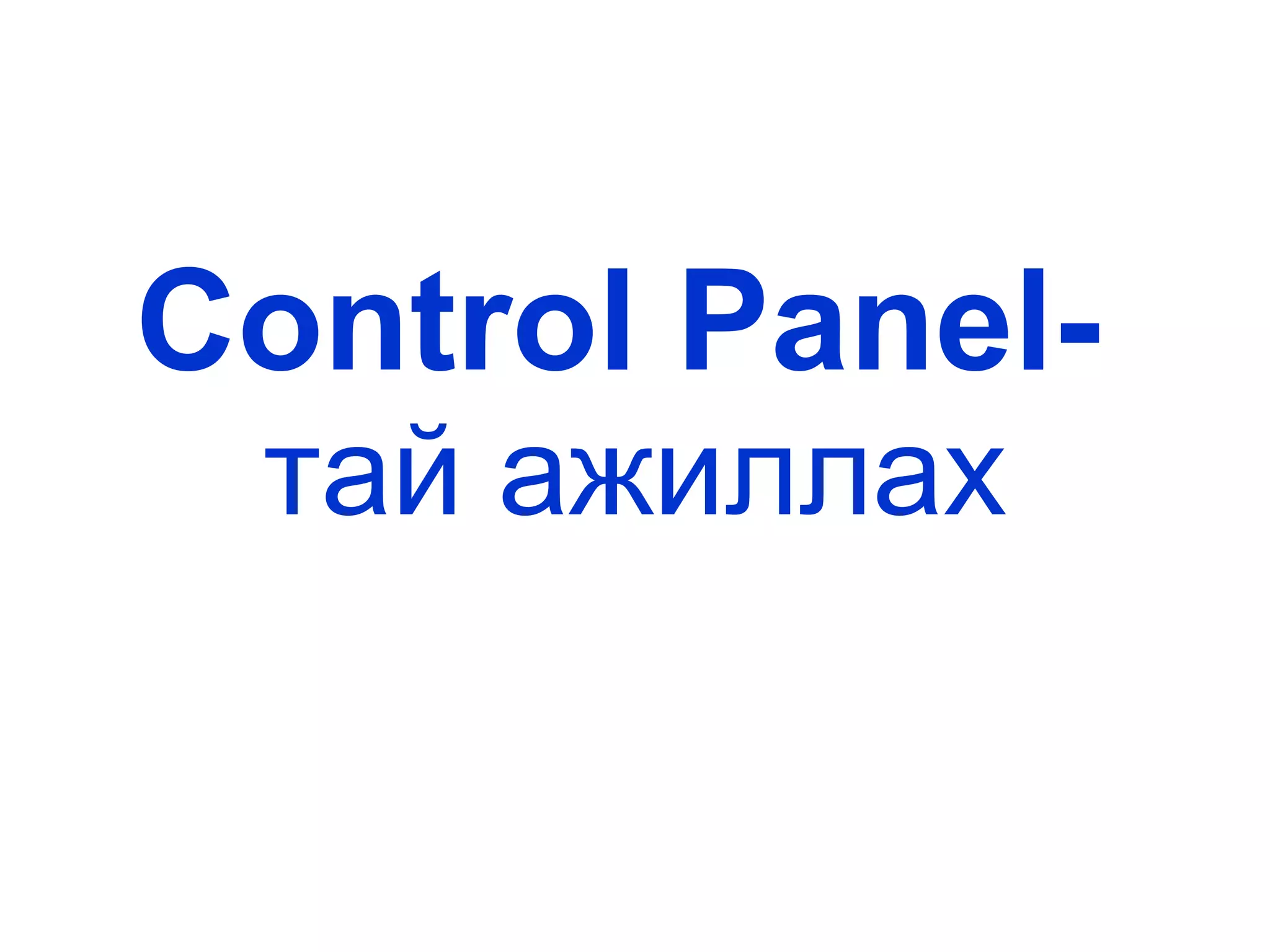 Control panel 1. 2. 3. 4. 5. 1. Font – ийг тохируулах Энэхүү зурган дээр double click хийнэ 6. 7. Font суулгах Суулгах гэж буй фонтуудаа сонгоно. Control Panel цонхны Fonts хавтсыг нээж хулганы баруун товч дарж Paste командыг сонгоно. Дараах зурагт үзүүлэв. 8. 9. 10. 11. 12. Дэлгэцийн зургийг солих Background хэсгээс дэлгэцэн дээр гаргах зургаа сонгон ok дарна. Өөрөөр бас Browse товчин дээр даран сонгох зургаа идэвхжүүлээд open дар тэгээд ok дар. 13. Дэлгэц амраагчийг тохируулах цонхны харагдах байдал Дэлгэц амраагчыг тохируулахдаа Screen saver- ийг сонгоно 14. Дэлгэц амраагчыг тохируулах Screen Saver – Дэлгэцэн дээр амрах зургийг сонгох. Wait – Компьютер ашиглаагүй үед хэдэн минутын дараа дэлгэцийг амраахыг зааж өгнө ok дар. 15. 16. 17. 18. 19. 20. 21. 22. 23. 24. 25. 26. 27. 4. М онгол гарын драйверыг суурилуулах 28. 29. 30. 1. Start цэсний Control Panel хэсэг рүү орно. 2. Control Panel - ийн Regional and LanguageOptions цэс рүү орно . 3. Regional and Languages Options цонхны Languages цэс рүү орж Details товчийг дарахад (1) хэсэгт Mongolian (Cyrillic) фонд байвал OK товчийг дарна . Байхгүй бол (2)- т байгаа Add товчийг дарж , тэнд гарч ирэх хэлний жагсаалт дундаас Mongolain (Cyrillic) - ийг сонгож нэмээрэй . Ингээд OK товчлуурыг дарна . А нгли болон монгол үсгий г хооронд нь солихдоо компьютерийн гарын зүүн талын Alt + Shift товчийг хамтад нь дарн а . 31. 32. 33. 5. Taskbar- ийг тохируулах Энэхүү зурган дээр double click хийнэ 34. Lock the taskbar- Taskbar - ийг цоожлох Auto-hide the taskbar- Taskbar –ийг нуух, хулганы заагч очиход гарч ирэх. Keep the taskbar on top of other windows- Taskbar - ийг бүх цонхны өмнө гаргах. Group similar taskbar buttons –ижил програмуудын цонхыг групплэх. Show Quick Launch – Түргэн эхлүүлэх командууд Show the clock – Цаг Taskbar дээр ил гаргах. Hide inactive icons - Taskbar-ийн баруун талд байрлах идэвхгүй тэмдэгтийг нуух. Lock the taskbar- Taskbar - ийг цоожлох Auto-hide the taskbarTaskbar –ийг нуух, хулганы заагч очиход гарч ирэх. Keep the taskbar on top of other windows- Taskbar - ийг бүх цонхны өмнө гаргах. Group similar taskbar buttons –ижил програмуудын цонхыг групплэх. Show Quick Launch – Түргэн эхлүүлэх командууд Show the clock – Цаг Taskbar дээр ил гаргах. Hide inactive icons - Taskbar-ийн баруун талд байрлах идэвхгүй тэмдэгтийг нуух. 35. Start цэс яаж задрахыг тохируулж өгөх - Start menu - Classic Start menu дээрх 2 хэлбэрийн аль нэгийг сонгоно. 36. 37. 38. 39. 40. 41. 42. 43. Type your current passwort- хуучин паспортыг оруулна 2. Type a new passwort - Шинэр үүсгэх гэж буй паспортыг оруулна 3. Type the new passwort again to confirm - шинэ паспортыг павтан оруулна 4. Change Password командыг сонго 44. 45. The picture you choose will appear on the хэсгээс- Ямар зураг харагдахыг сонго Change Picture- ийг сонго. 46. 47. Date- хэсэгт он болон өдрийг тохируулж өгнө Time- цагийг тохируулж өгнө Ингээд тохриуулсныхаа дараа Ok товч дар. 48. 49. 50. 51. 52. 53. 54.