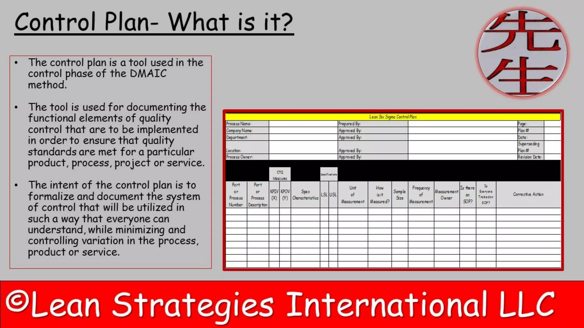 The control plan is one tool or method used to describe a set of the activities and/or procedures that are needed to control a process and deliver a quality output (Y). The overall objective of the control plan is to maintain stability and control of a process ultimately minimizing and controlling variation.