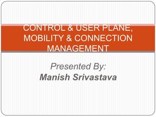This document discusses the key interfaces, architecture, and procedures related to control and user planes, mobility management, and connection management in 3G networks. The control plane handles protocols for controlling radio access bearers and the connection between UE and network. It has physical, data link, and network layers. The user plane is responsible for transferring user data through access and core network protocols. Mobility management allows tracking and delivering services to mobile subscribers via location management, registration, and security functions. Connection management establishes and maintains connections to exchange information with peer entities.