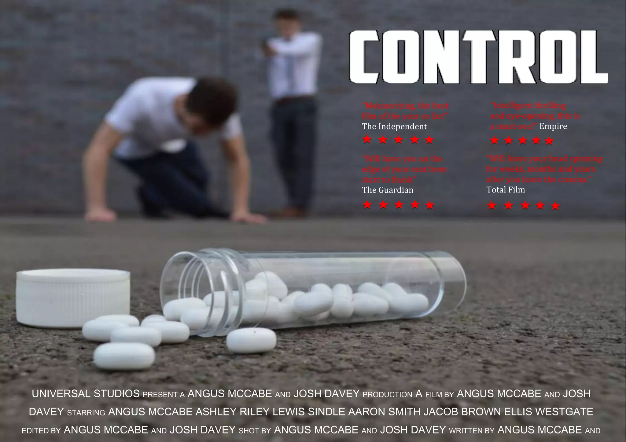The document provides excerpts from four positive reviews praising an unnamed film as mesmerizing, thrilling, and intelligent, leaving viewers on the edge of their seats. It also lists the filmmakers and stars but does not include the title of the film being summarized.