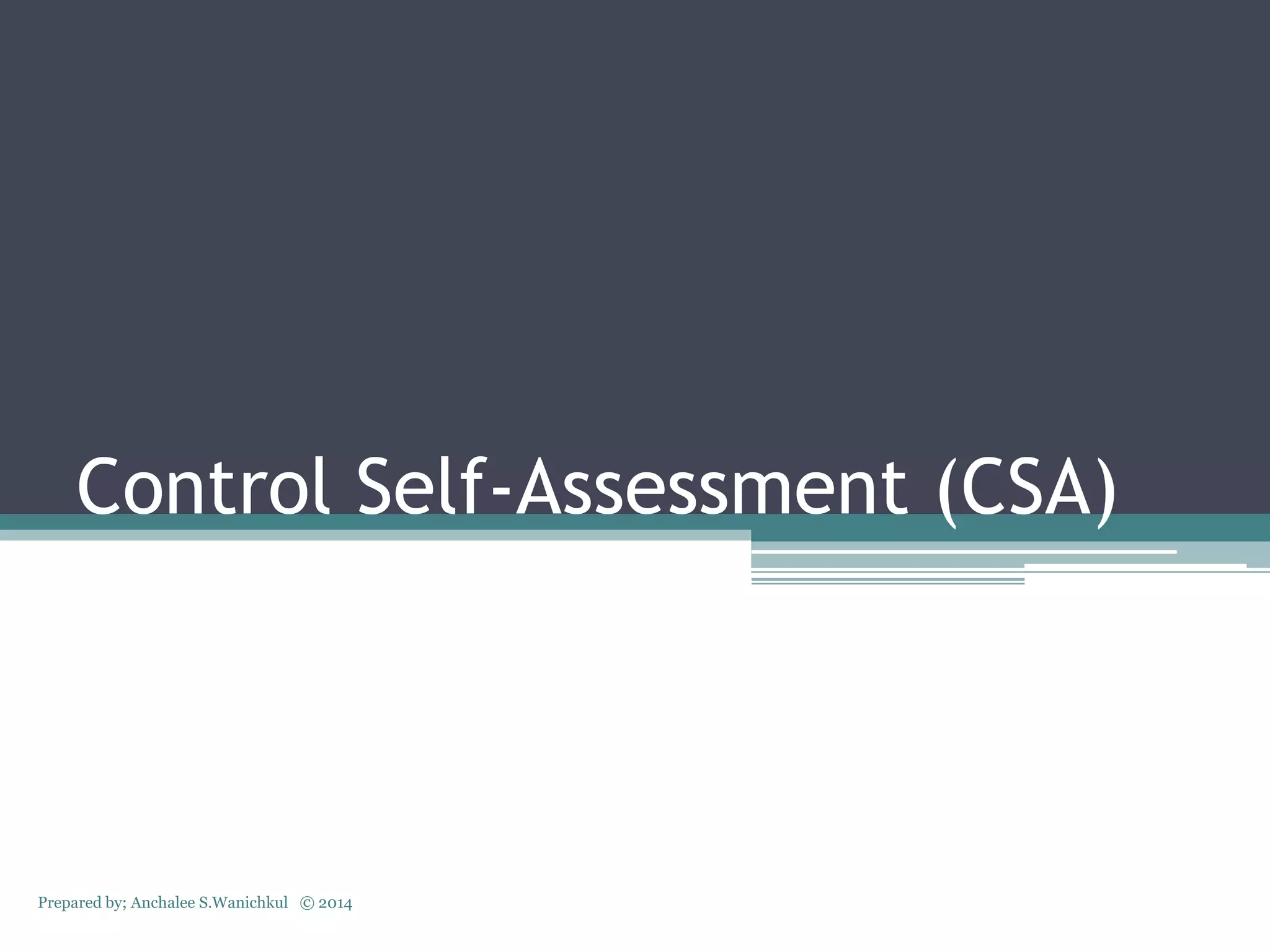 Control Self-Assessment (CSA) allows managers and employees to directly assess an organization's risk management and internal controls. CSA helps clarify business objectives, identify risks to achieving objectives, and ensure controls and regulations are followed. The CSA process involves employees self-evaluating controls and processes through activities like risk identification, control assessment, and action planning. Benefits of CSA include improved understanding and responsibility for controls, more effective corrective actions, and increased awareness of objectives. However, CSA may face resistance to change and requires open and honest participation to provide accurate results.