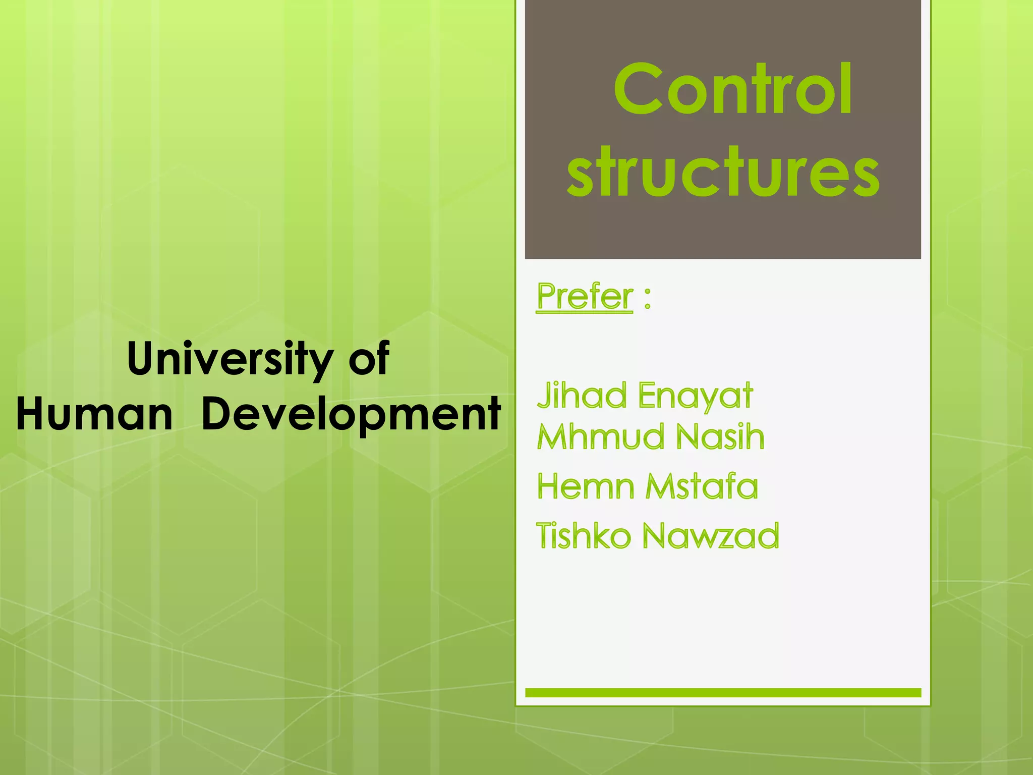 The document discusses various Java control structures including if/else statements, for loops, switch statements, and while/do-while loops. It provides the syntax and flow for each structure and includes examples to demonstrate their usage. Key control structures covered are if/else for conditional execution, for loops for repetitive execution a set number of times, switch statements for evaluating a variable against multiple case values, and while/do-while loops for repetitive execution an unknown number of times until a condition is met.