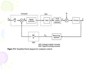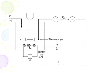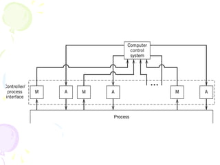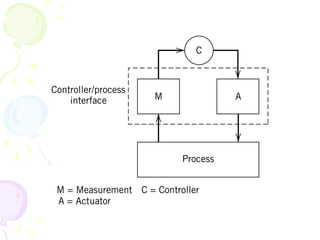This document discusses instrumentation and control systems. It provides information on common devices used to measure process variables like pressure, temperature, and flow rate. These include transducers, sensors, and transmitters. It also discusses final control elements like control valves and how they are used to manipulate process variables. The document explains the characteristics of different types of control valves and how their flow properties are defined by equations. It also covers topics like pneumatic control systems, calibration of instruments, and algorithms for digital PID control.