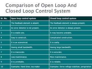 The document outlines control systems, emphasizing their necessity for automation in modern technology. It describes open loop and closed loop control systems, detailing their functions with examples like electric hand driers and automatic washing machines. Furthermore, it explores more complex automotive systems, such as fuel injection and anti-lock braking systems, which utilize sensors and actuators to optimize performance and safety.