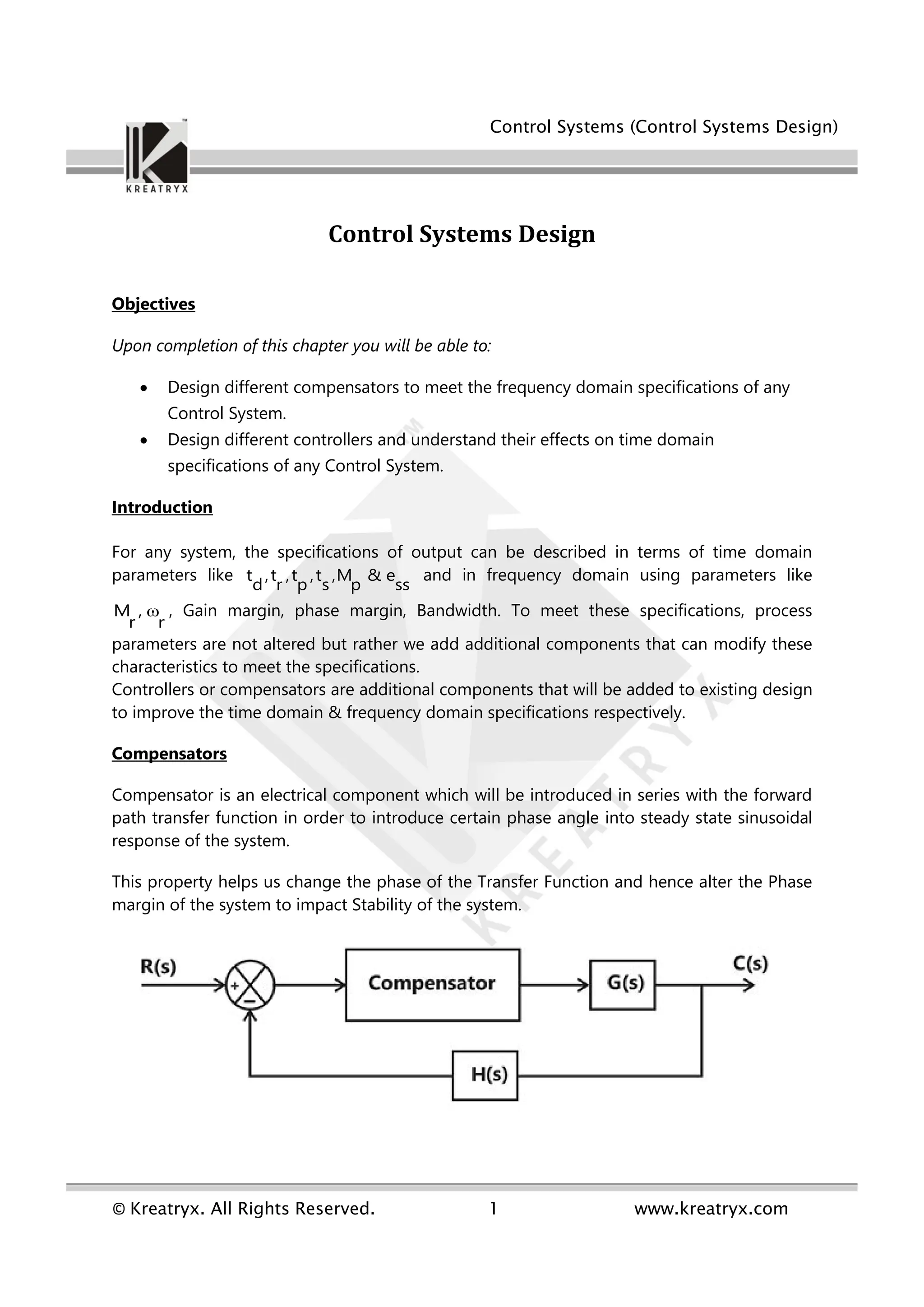 The document discusses control systems design, focusing on designing controllers and compensators to meet specific time and frequency domain specifications. It explains the characteristics and effects of various compensators, including lead, lag, and lag-lead compensators, as well as controllers such as proportional, derivative, integral, and PI controllers. Additionally, it highlights the impact of these components on system stability, transient response, and steady state errors.