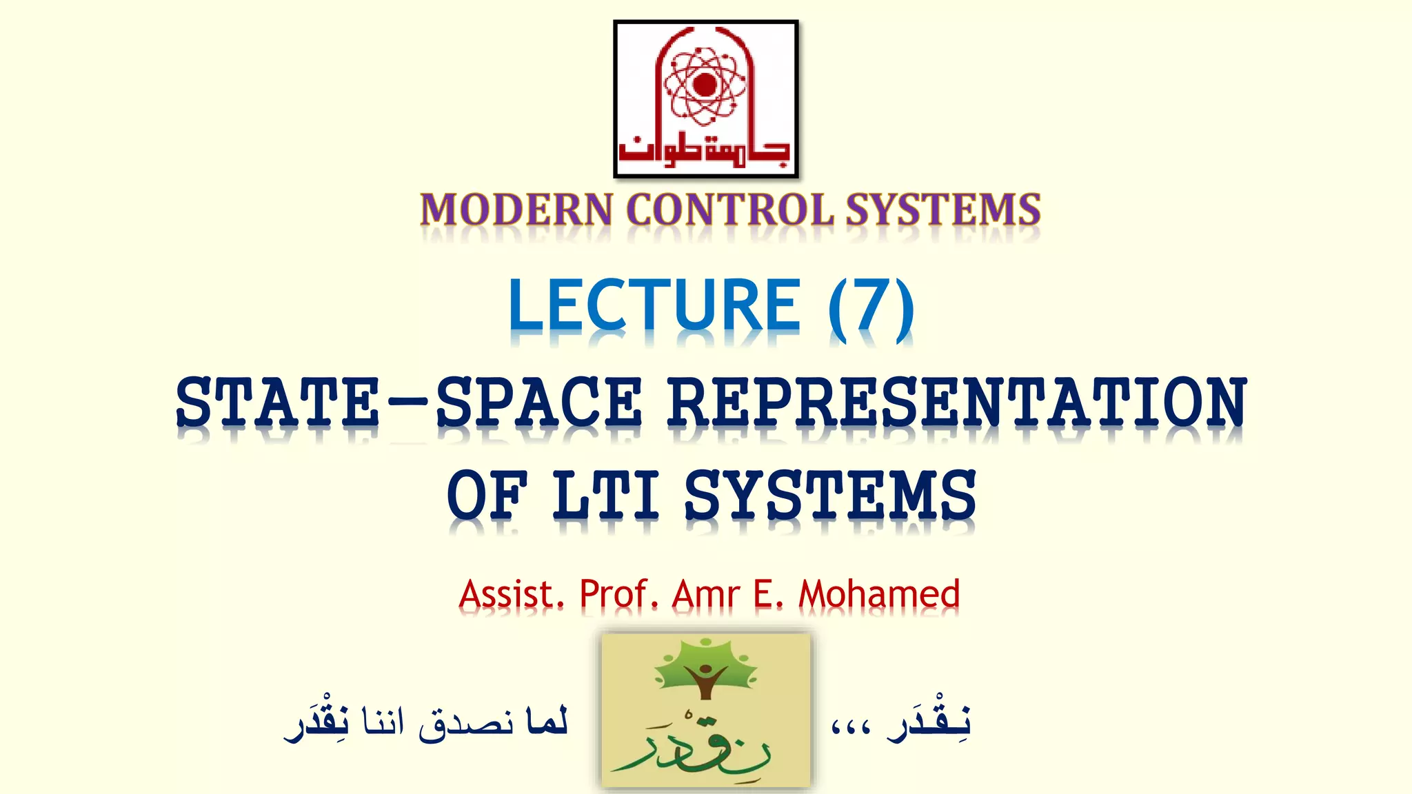 The document provides an overview of state-space representation of linear time-invariant (LTI) systems. It defines the state of a dynamical system and explains that the state-space approach models systems using sets of first-order differential equations rather than transfer functions. The key advantages of the state-space approach include its ability to model more complex multi-input multi-output systems and incorporate internal system behavior. Examples are provided to demonstrate how higher-order systems can be converted to state-space form by defining state variables and writing the corresponding state equations.