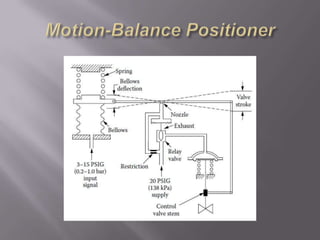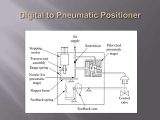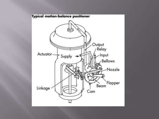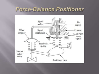 A positioner is a feedback controller device that ensures a control valve is in the correct position according to a control signal. It senses the valve's position and compares it to the signal from an I/P converter. Based on the difference or "error", it positions the valve to reduce the error to zero. Positioners improve the accuracy of a valve's response by reducing issues like friction, dynamic forces, and non-linearities. Modern digital positioners no longer require an I/P converter and offer additional features like diagnostics and partial stroke testing.