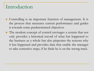 The document discusses the process of management control, highlighting its importance in measuring performance against predetermined objectives and taking corrective actions when necessary. It outlines key steps in the control process, the essentials of effective control systems, and the relevance of budgetary and non-budgetary control devices in ensuring organizational efficiency. Additionally, it introduces management audits as tools for systematically evaluating overall management performance and planning resources effectively.