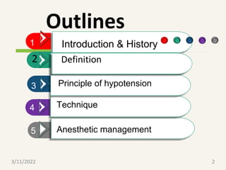 This document provides an outline and overview of controlled hypotension during anesthesia. It begins with definitions and a brief history of controlled hypotension. It then discusses the principles and techniques of inducing hypotension, including pharmacological agents like sodium nitroprusside, nitroglycerin, beta blockers, and calcium channel blockers. It also covers non-pharmacological techniques like positioning and acute normovolemic hemodilution. Monitoring, fluid management, and postoperative care are also outlined. The document concludes with sample multiple choice questions related to controlled hypotension.