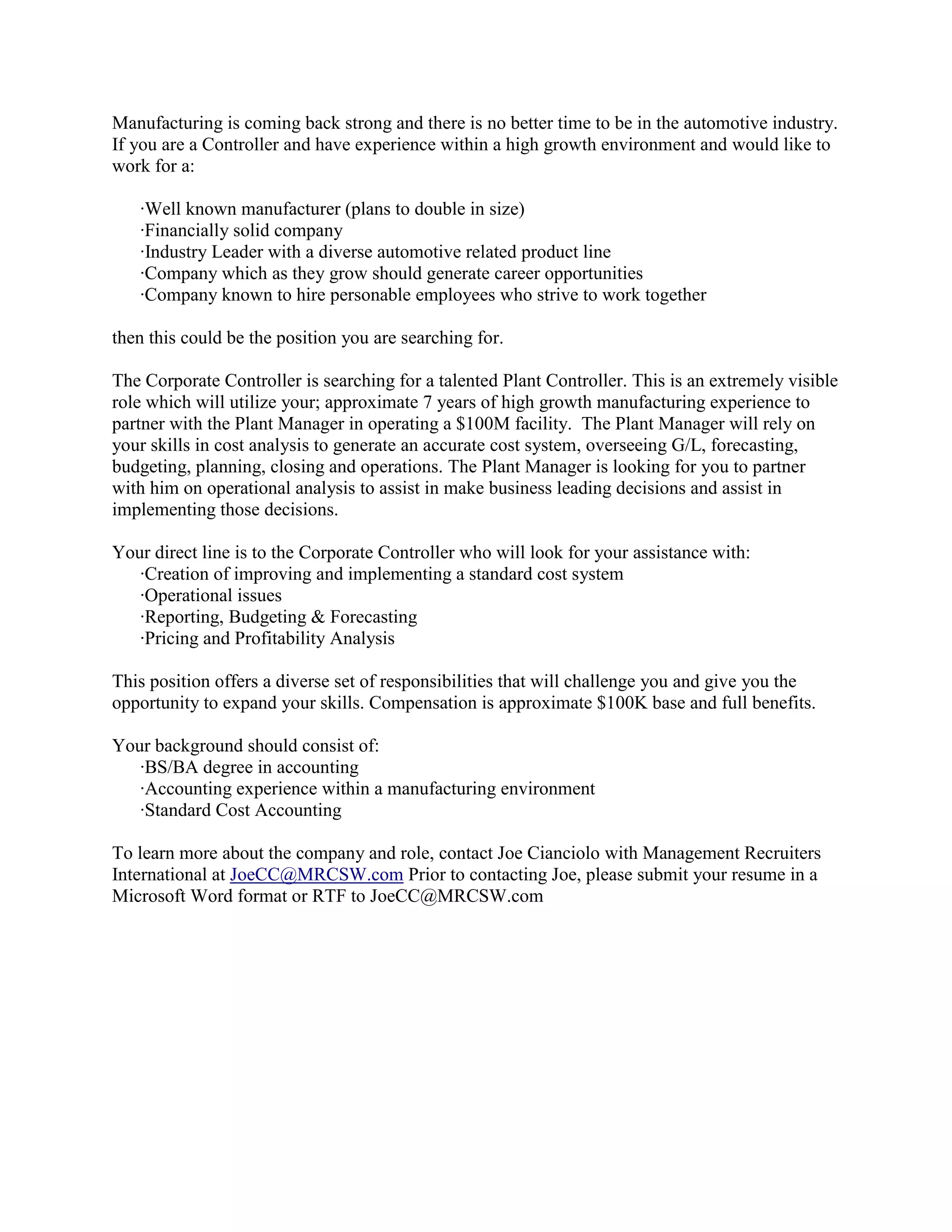 This document summarizes a job opportunity for a Plant Controller at a growing automotive manufacturer. The company is seeking a candidate with 7 years of manufacturing accounting experience to oversee financial operations at a $100 million facility and partner with the Plant Manager on cost analysis, budgeting, forecasting, and decision making. Key responsibilities include implementing a standard cost system, operational analysis, reporting, and pricing analysis. The position offers a diverse and challenging role with a base salary of $100k and full benefits. Qualified candidates should have a degree in accounting and experience in manufacturing and standard cost accounting.