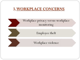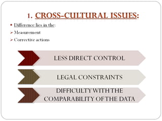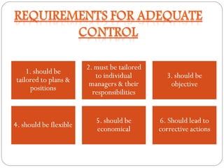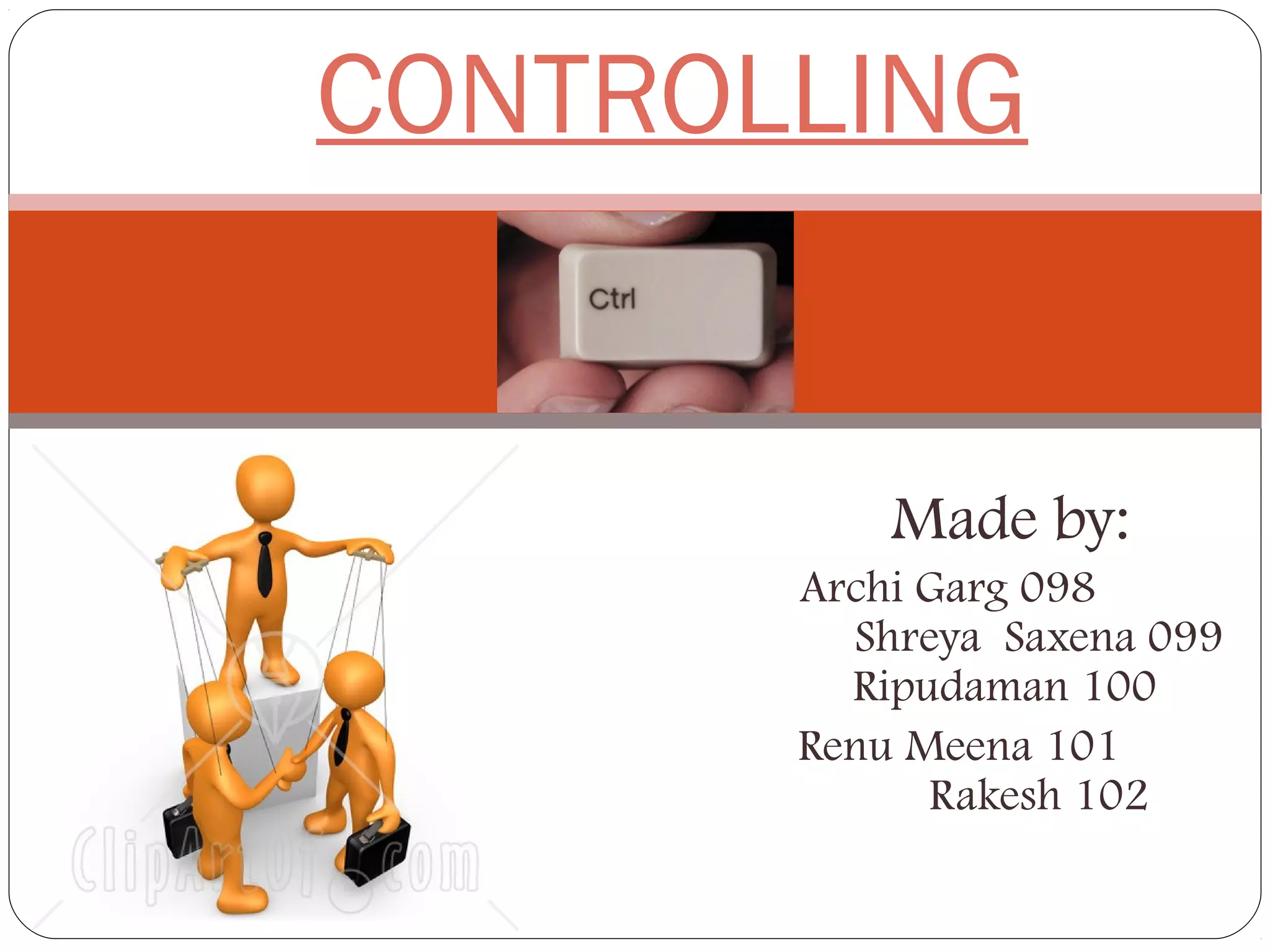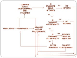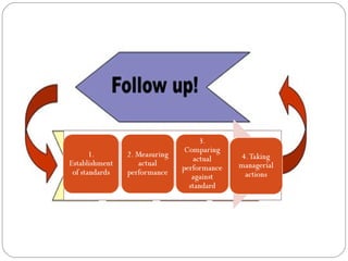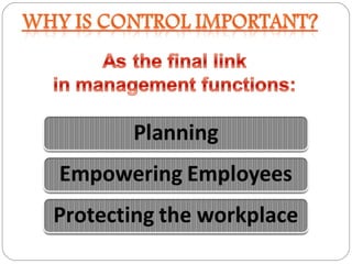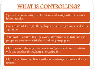 The document discusses the topic of controlling in management. It provides a 4-step controlling process: 1) establishing objectives and standards, 2) measuring actual performance, 3) comparing actual performance to standards, and 4) taking corrective actions. It also discusses different tools that can be used for organizational control, such as budgetary control, financial ratio analysis, PERT/CPM methods, and balanced scorecards. Contemporary issues in control mentioned include workplace privacy vs monitoring, employee theft, workplace violence, and corporate governance.