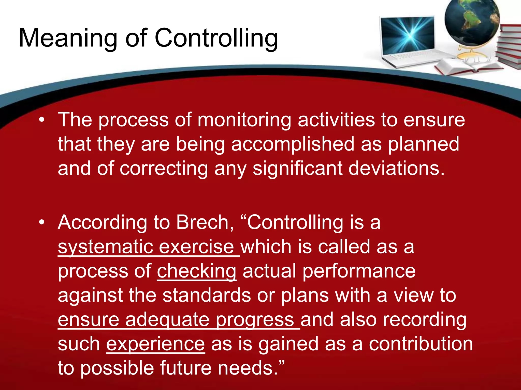 Controlling is the process of monitoring activities to ensure they are accomplished as planned and correcting deviations. It is a systematic, continuous process that involves establishing standards, measuring performance, comparing actual results to standards, and correcting deviations. Planning precedes controlling, and controlling ensures plans are followed. The controlling process establishes measurable standards, measures performance, compares actual results to standards, and corrects any deviations through actions like revising plans or processes. There are different types of controls, including feed forward controls to prevent deviations, concurrent controls to monitor ongoing work, and feedback controls to review work after it is done.