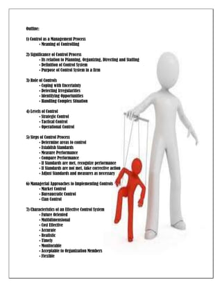 The document discusses the concept of controlling as a management process that involves regulating organizational activities so actual performance meets standards and goals. It defines controlling and explains its significance and relation to other management functions like planning, organizing and directing. The document also outlines the roles of controls, levels of control, steps in the control process, managerial approaches to implementing controls, and characteristics of an effective control system.