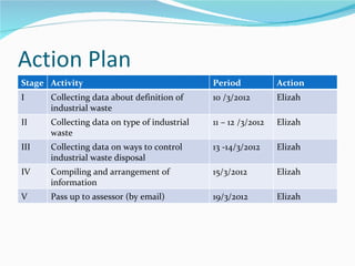 Elizah created an action plan to investigate how to control industrial waste disposal from March 10-19, 2012. The plan involved collecting data on definitions, types, and control methods of industrial waste over a period of 5 days. On March 15, Elizah compiled the information and on March 19 passed it to an assessor via email. The overall aim was to understand how to manage industrial waste and control disposal in the environment.