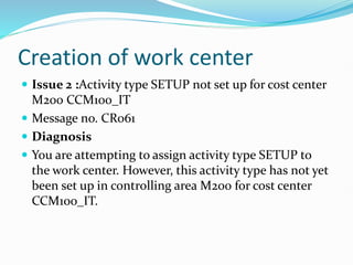 The document discusses four issues related to work centers and standard cost estimates in SAP and provides solutions for each issue. The issues are: 1) An activity type not being set up for a cost center. 2) Need to maintain activity prices under the cost center before creating a work center. 3) Activity values showing as zero in the standard cost estimate. 4) Unable to determine a consumption account when running the standard cost estimate. The solutions provided include checking the activity prices and cost centers set up in output planning and the work center, and verifying account determinations and currency settings.